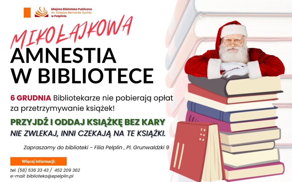 6 grudnia 2025 r. ogłaszamy Mikołajkową amnestię w bibliotece w Filii Pelplin.