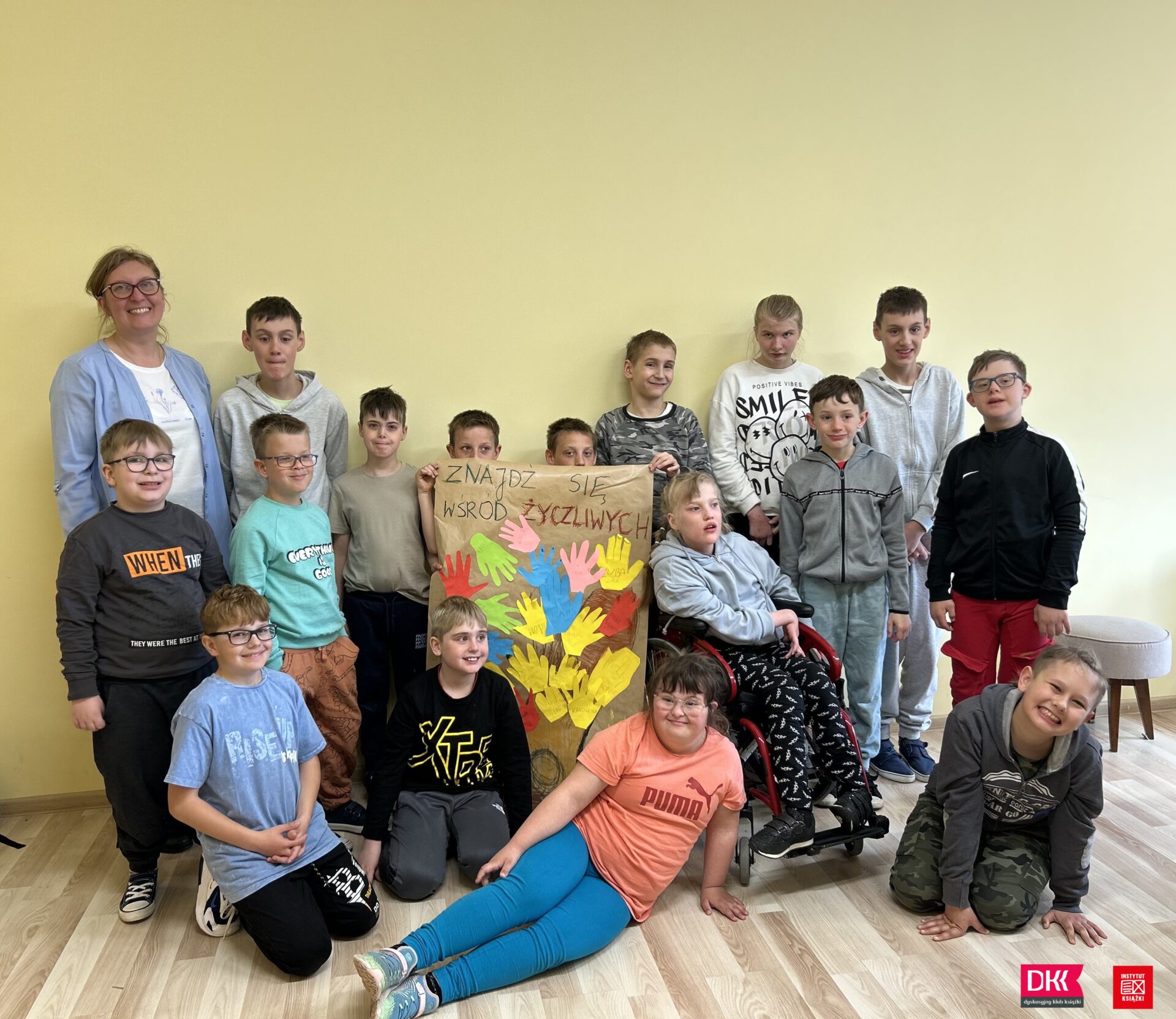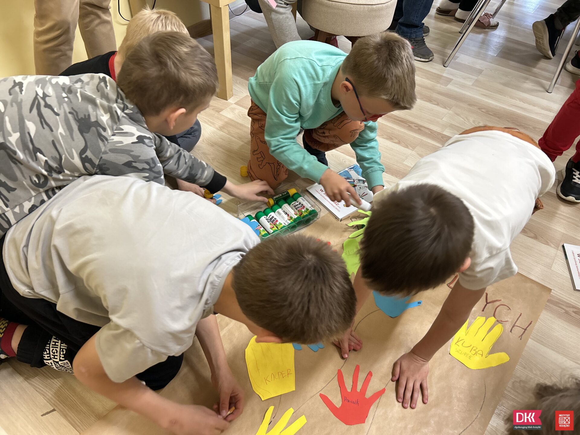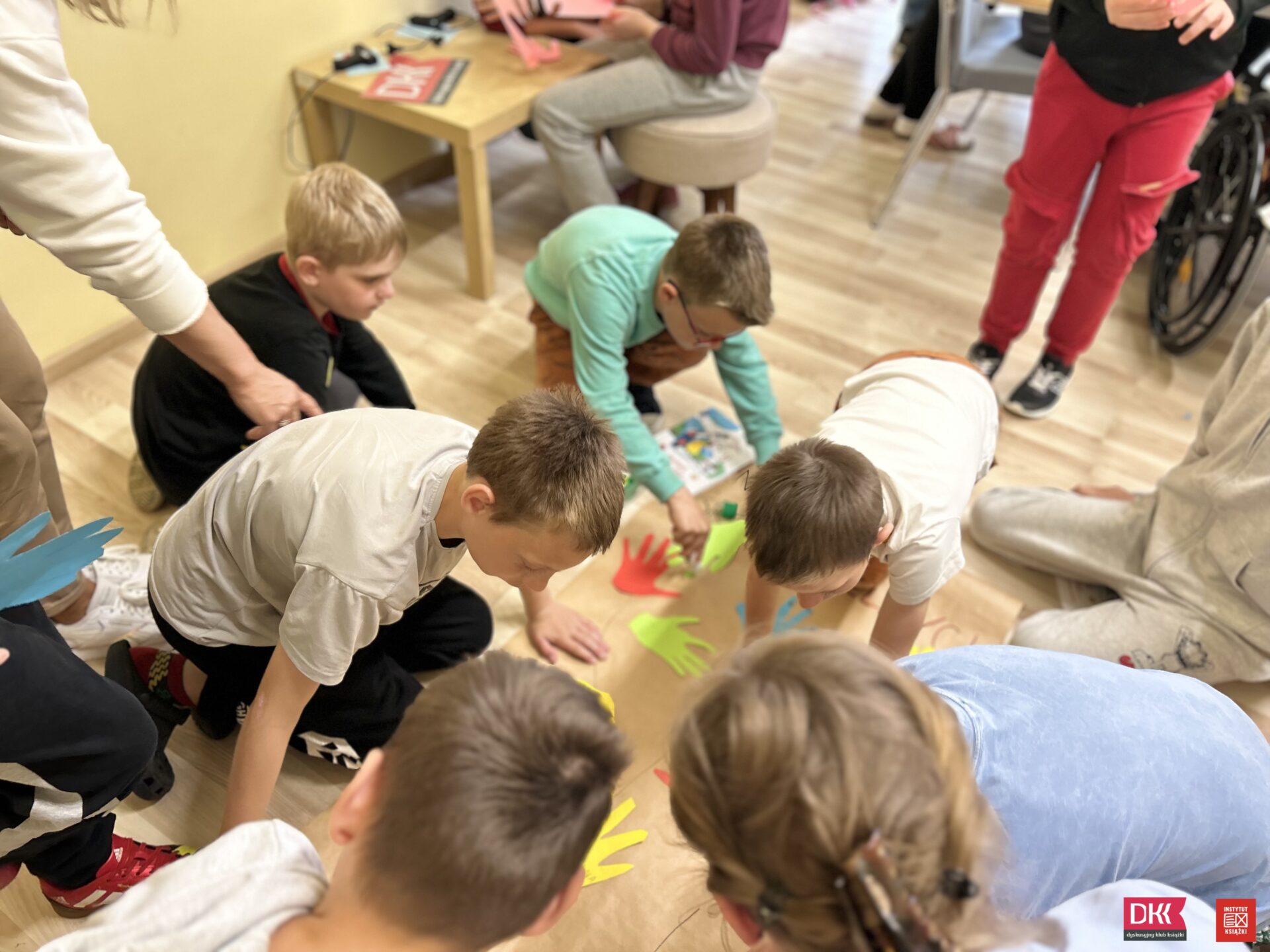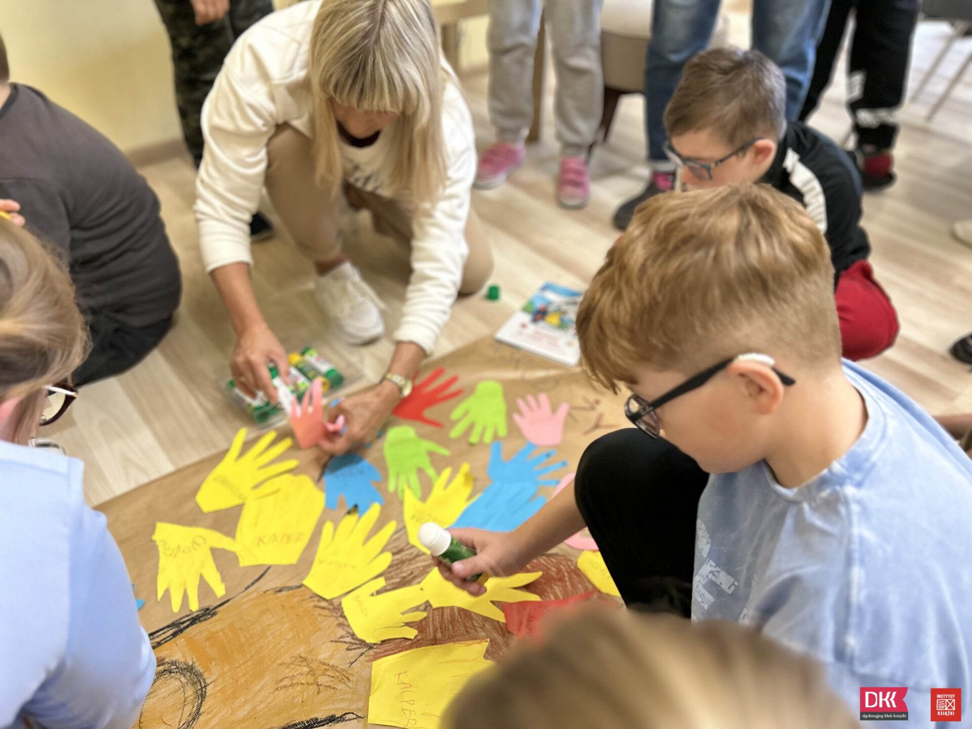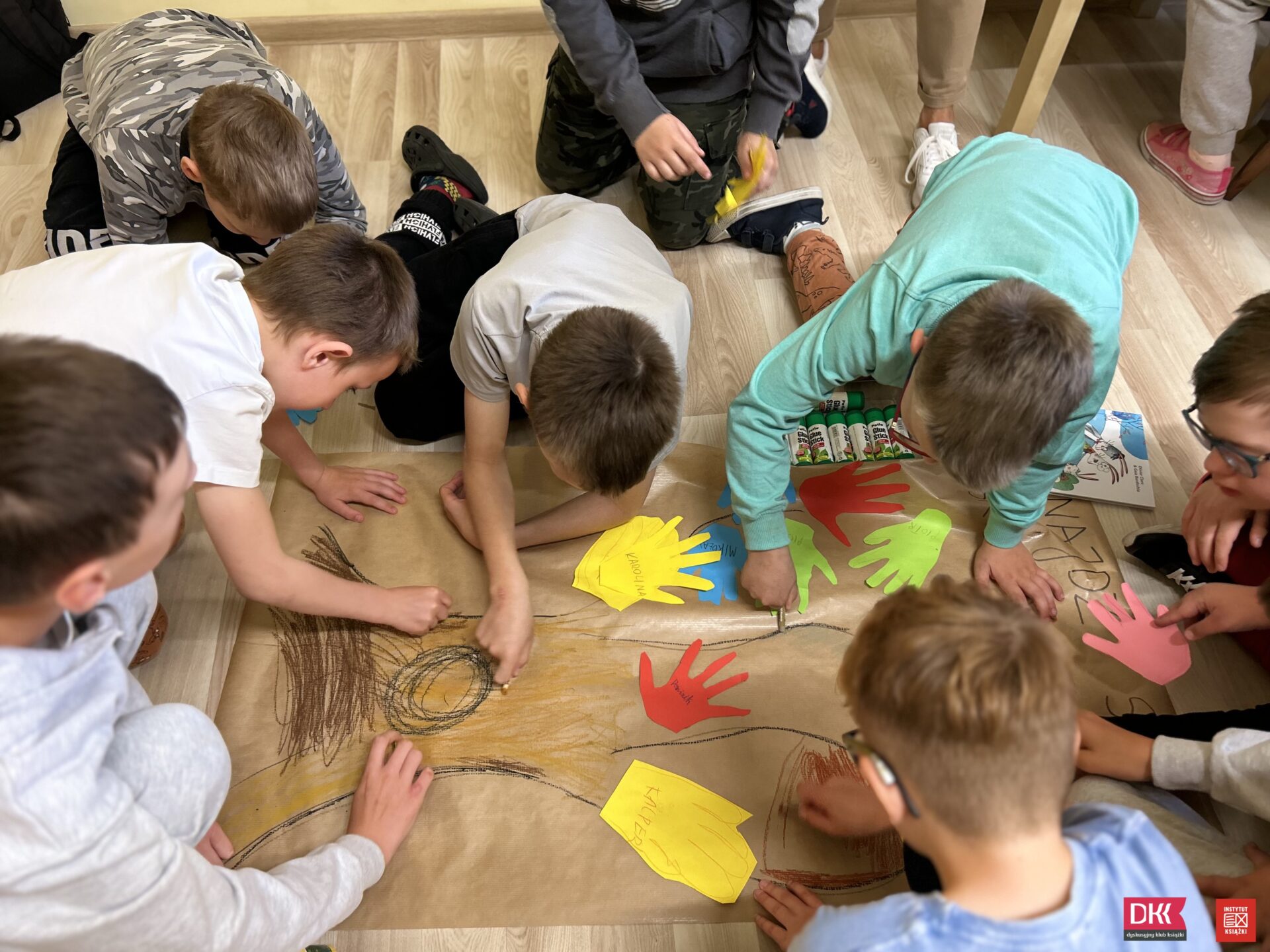 Na zakończenie spotkania uczniowie Sosw w Pelplinie im. Św. Józefa wykonali plakat inspirowany treścią książki. Znalazło się na nim wielkie drzewo wypełnione odbiciami naszych rąk.