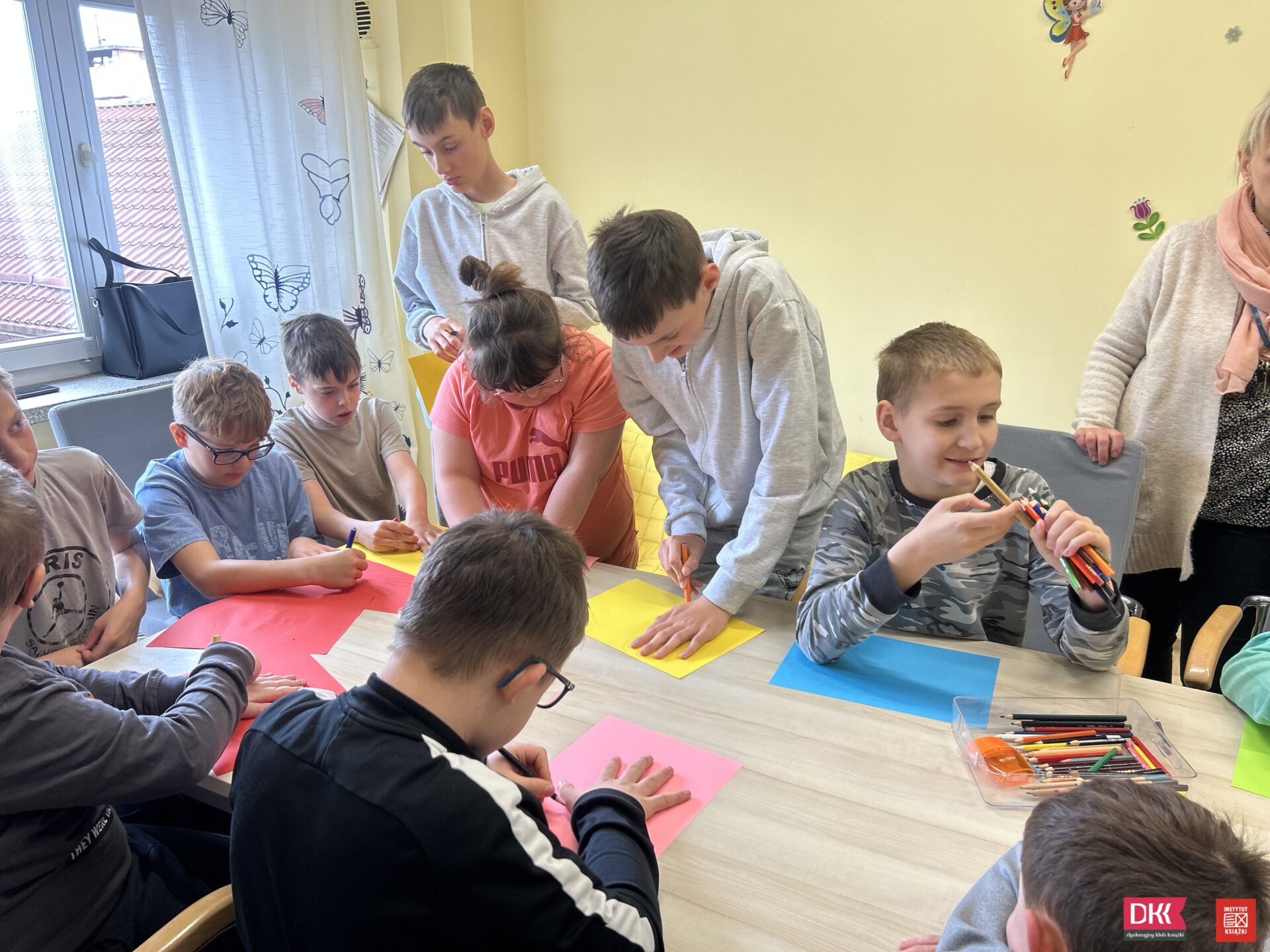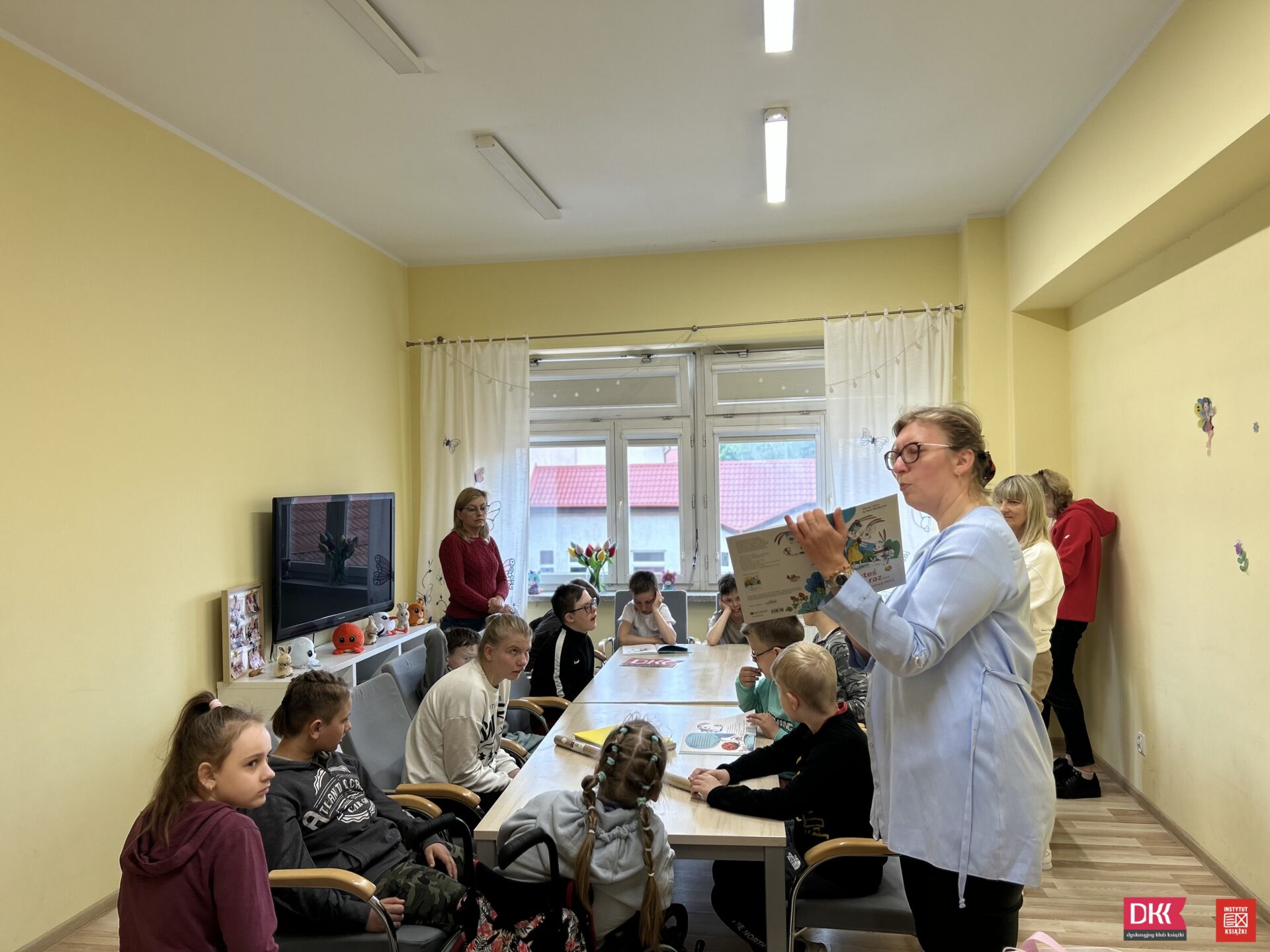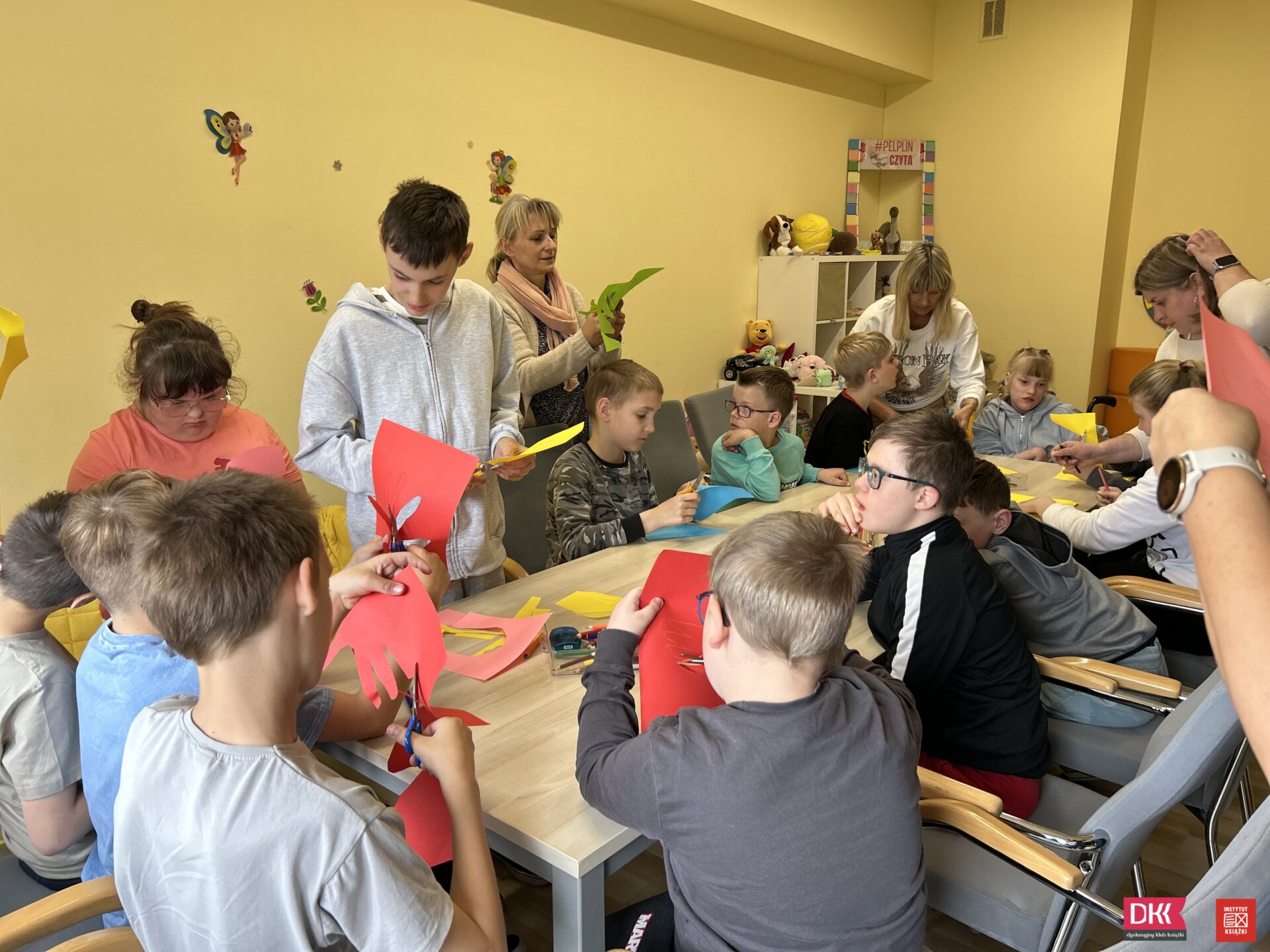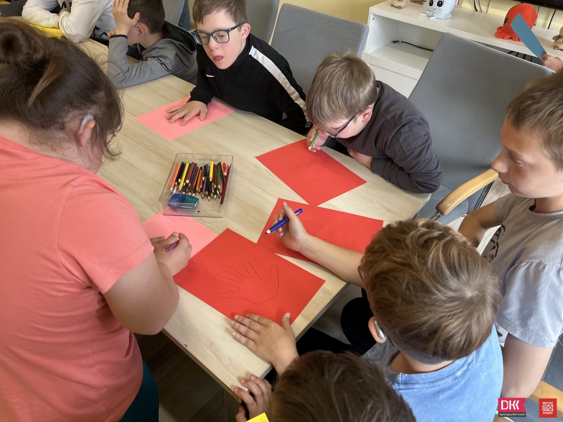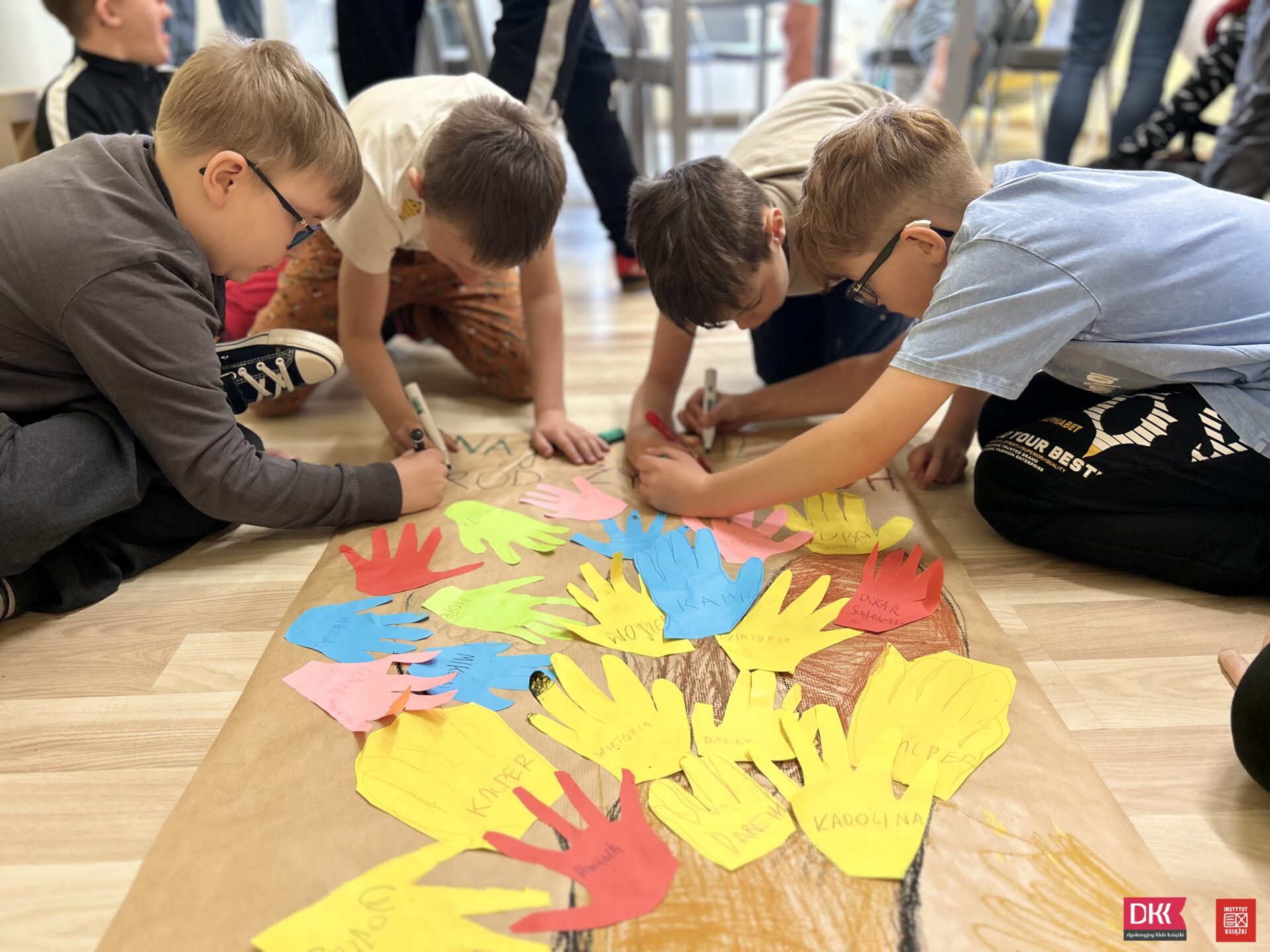 Na zakończenie spotkania uczniowie Sosw w Pelplinie im. Św. Józefa wykonali plakat inspirowany treścią książki. Znalazło się na nim wielkie drzewo wypełnione odbiciami naszych rąk.