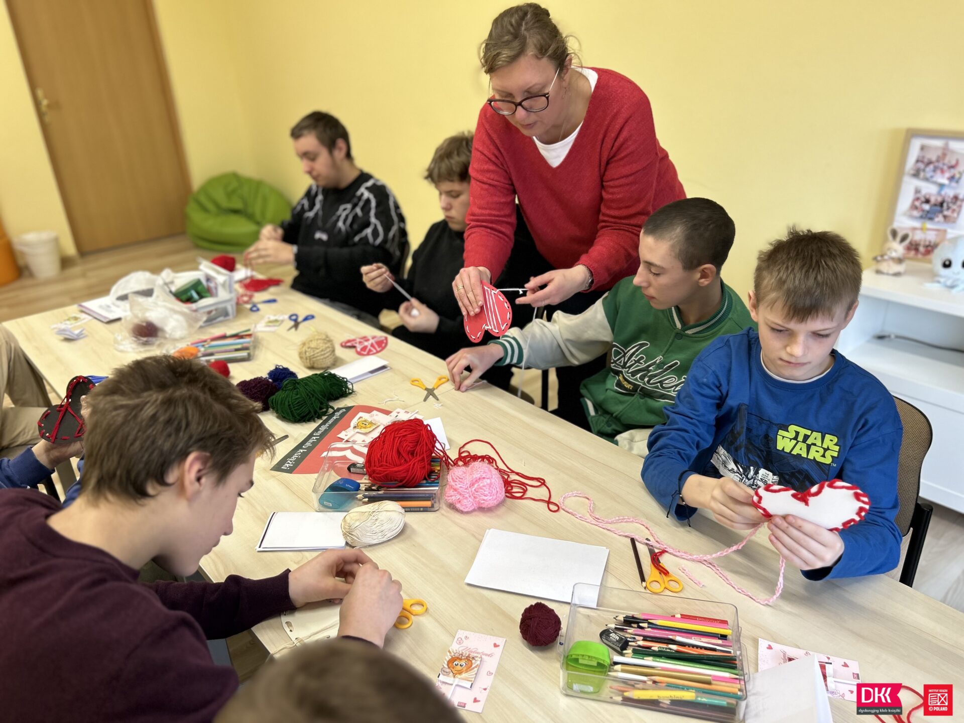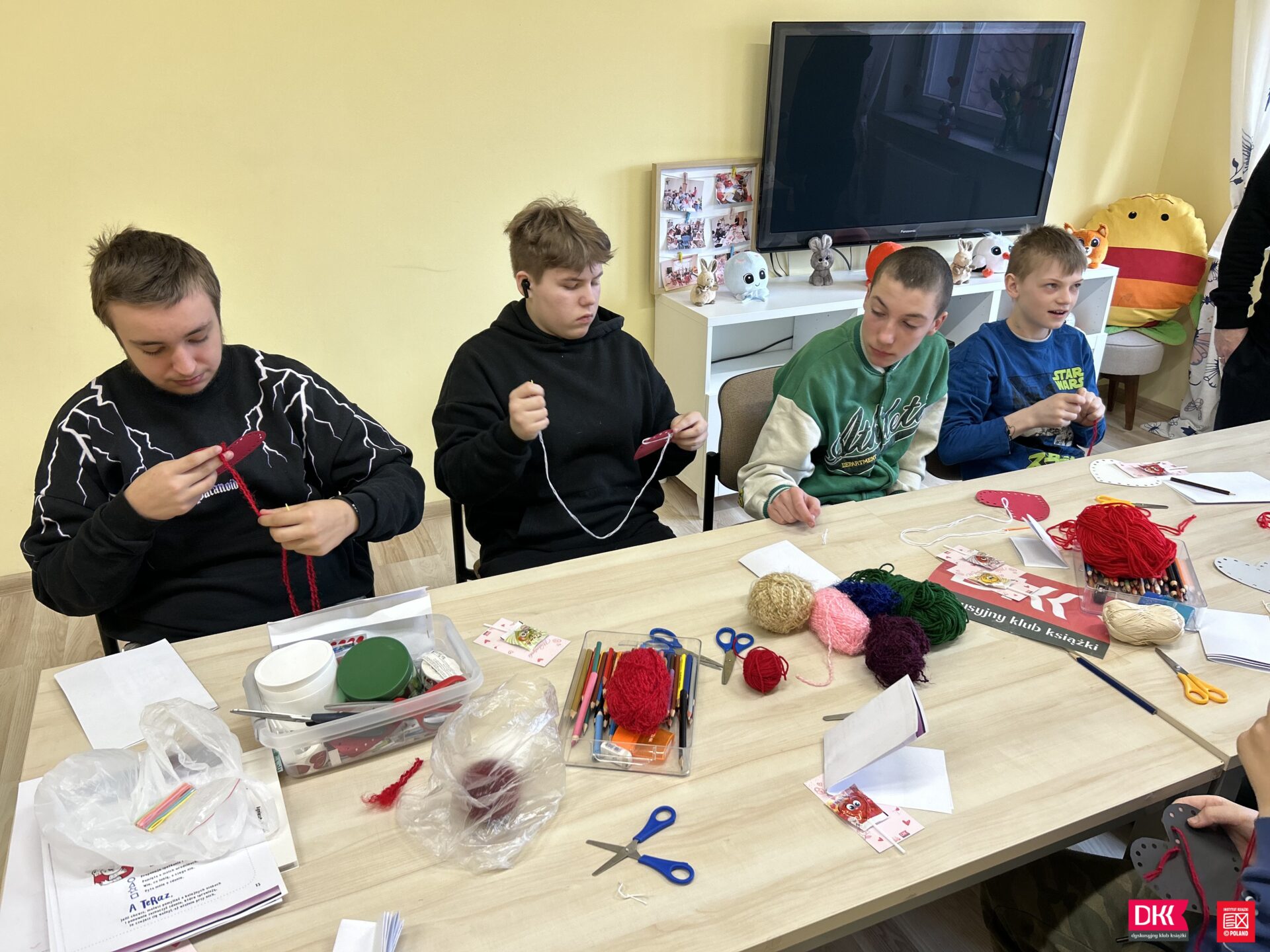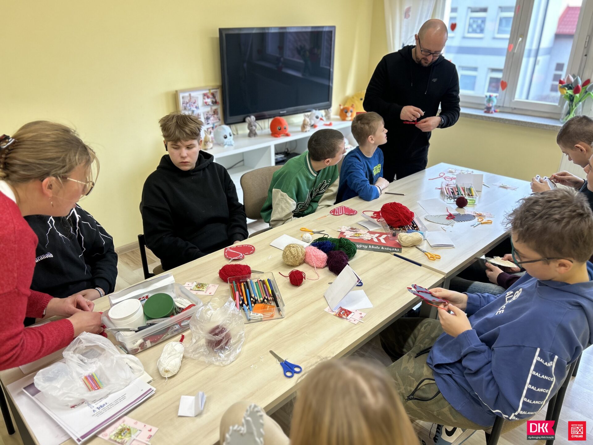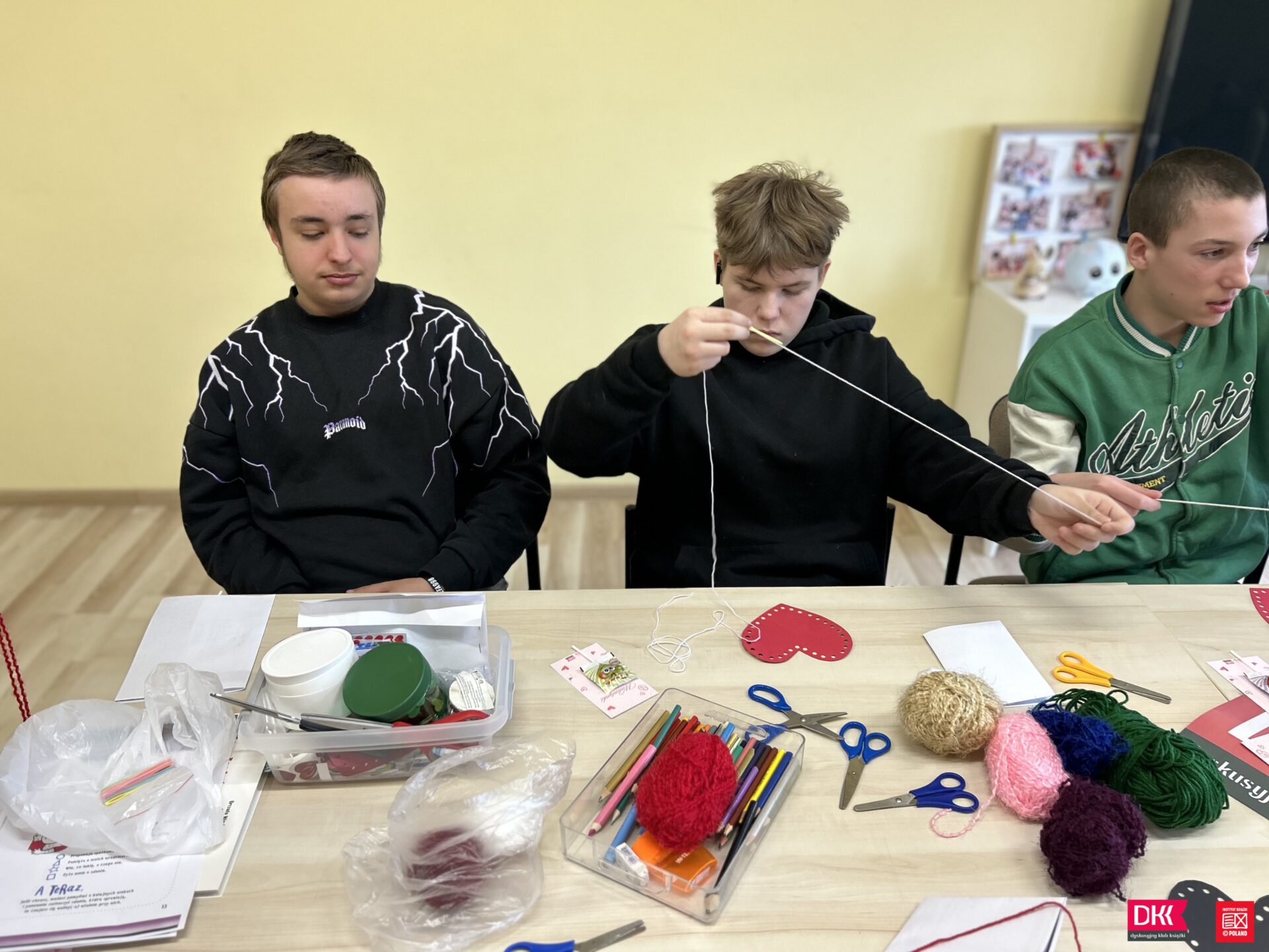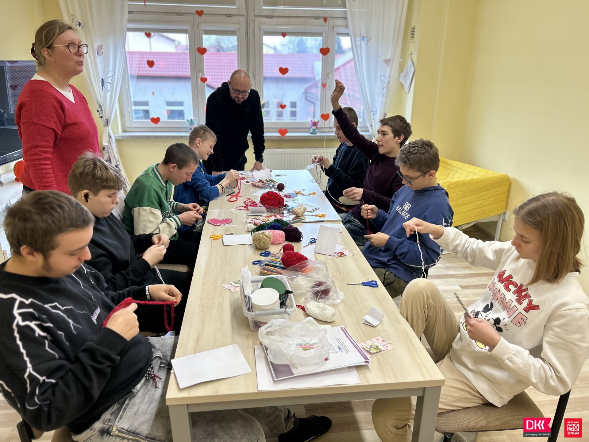 Po dyskusji przeszliśmy do drugiej części spotkania. Uczniowie Sosw w Pelplinie im. Św. Józefa wzięli do rąk papier, kolorowe sznurki oraz nożyczki, by stworzyć walentynkowe zawieszki dla swoich bliskich.