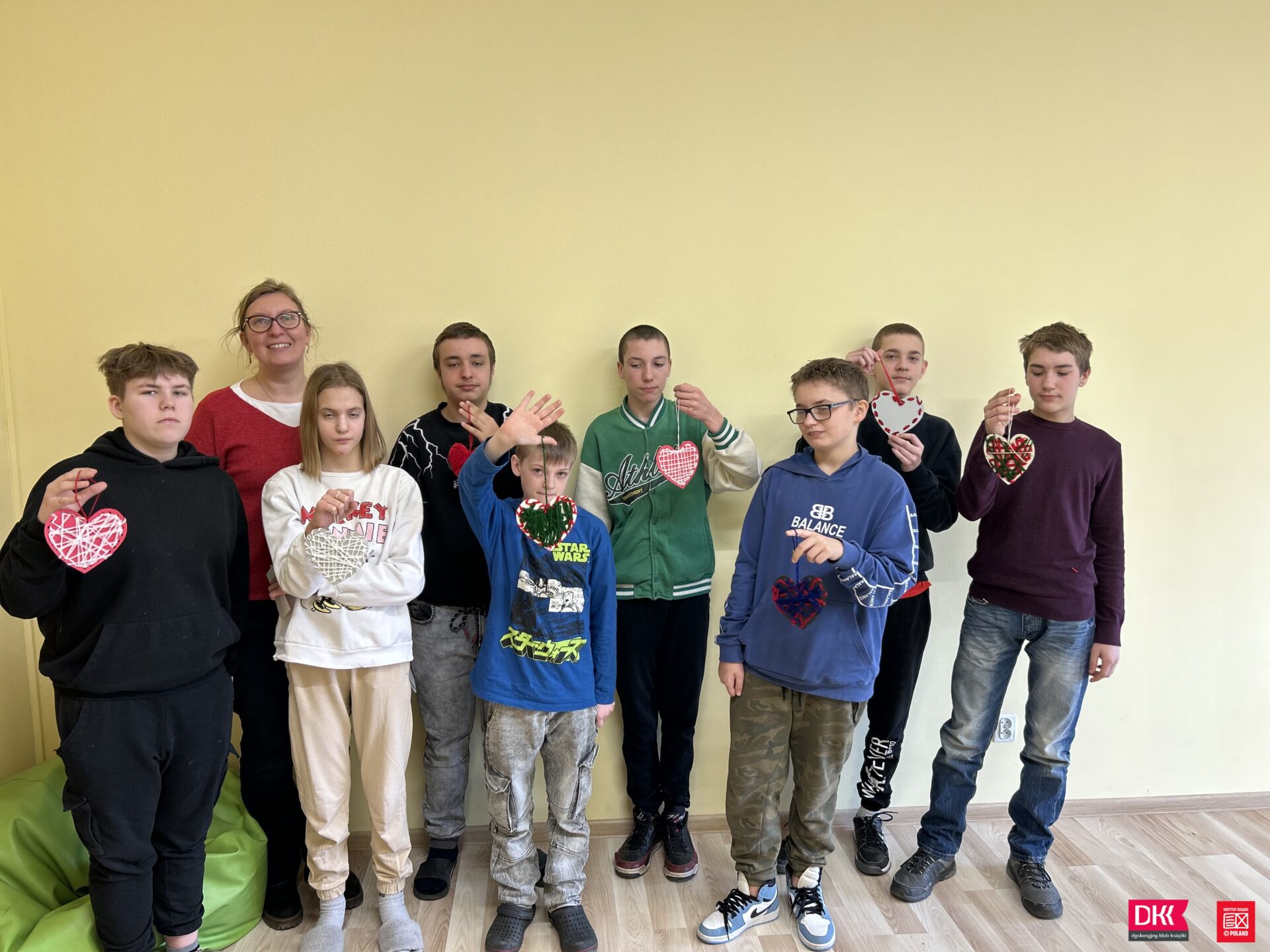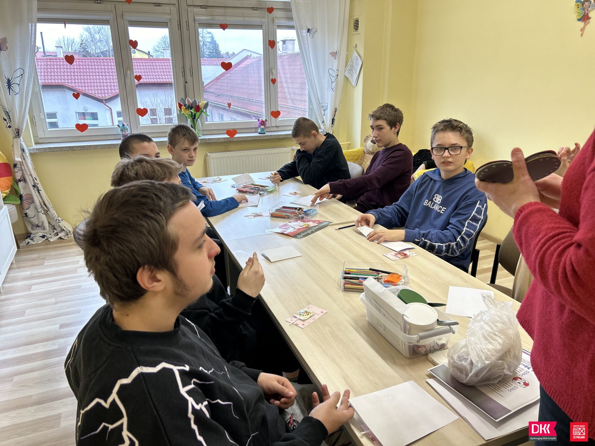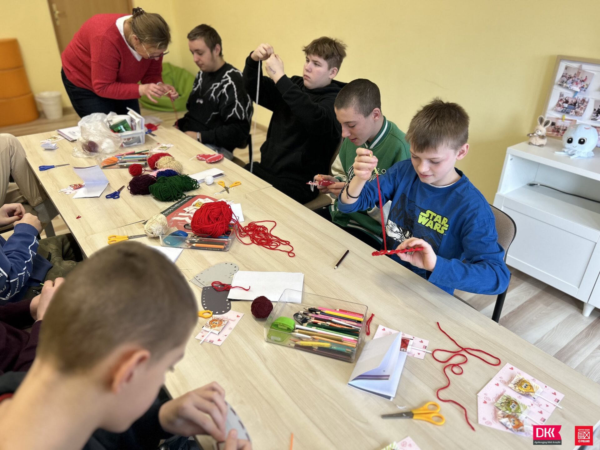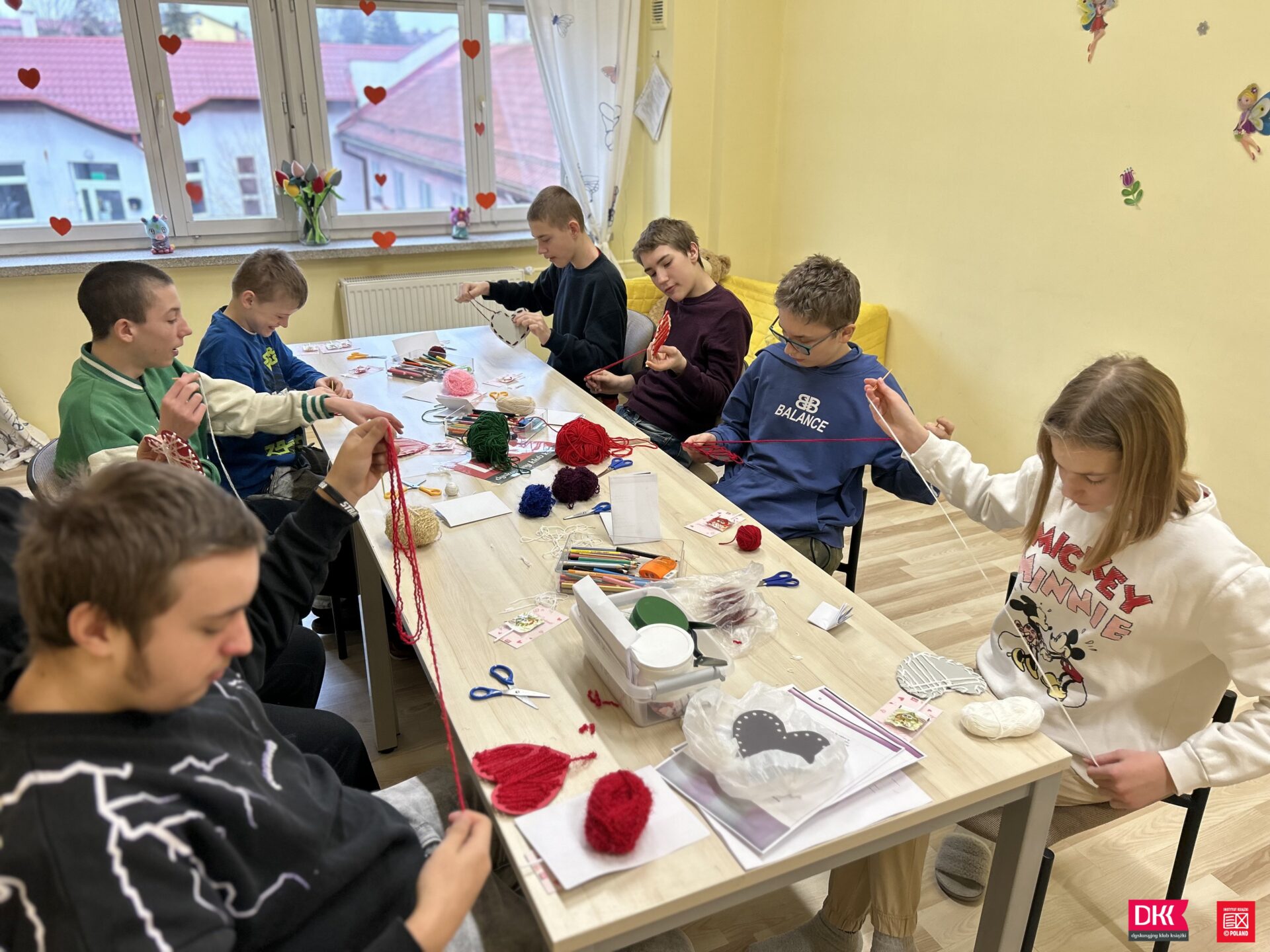 Po dyskusji przeszliśmy do drugiej części spotkania. Uczniowie Sosw w Pelplinie im. Św. Józefa wzięli do rąk papier, kolorowe sznurki oraz nożyczki, by stworzyć walentynkowe zawieszki dla swoich bliskich.