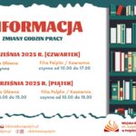 11 września 2025 r. [Czwartek] Biblioteka Główna: nieczynna Filia Pelplin/Kawiarenka: 10.00 – 17.00   12 września 2025 r. [Piątek] Biblioteka Główna: 08.00 – 15.00 Filia Pelplin/Kawiarenka: 10.00 – 18.00