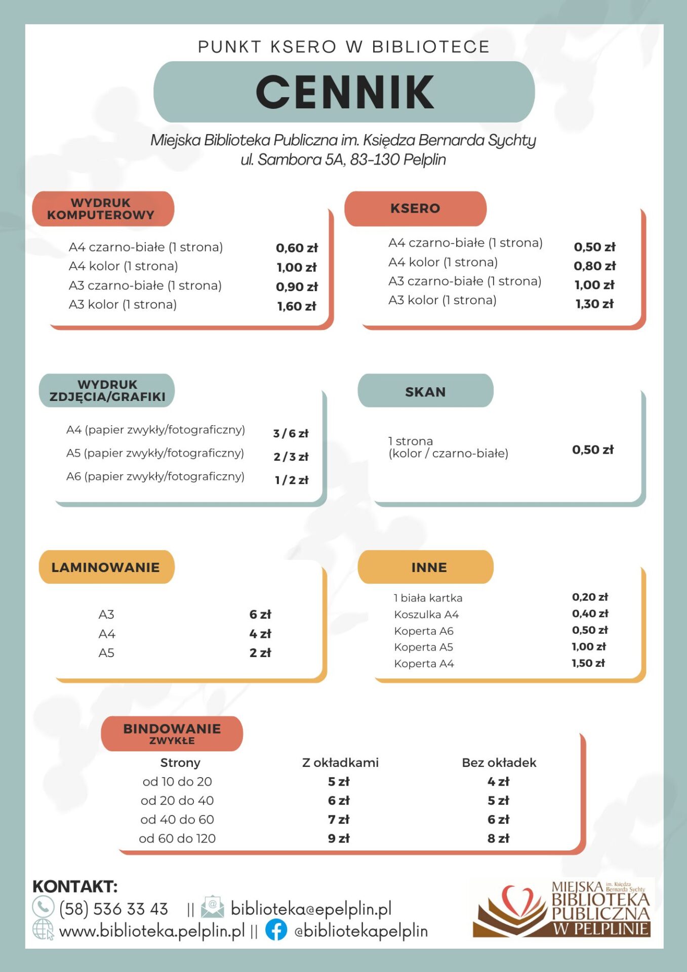 - 9 zł – opłata manipulacyjna za każde wysłane wezwanie do zwrotu materiałów (list polecony ze zwrotnym potwierdzeniem odbioru).