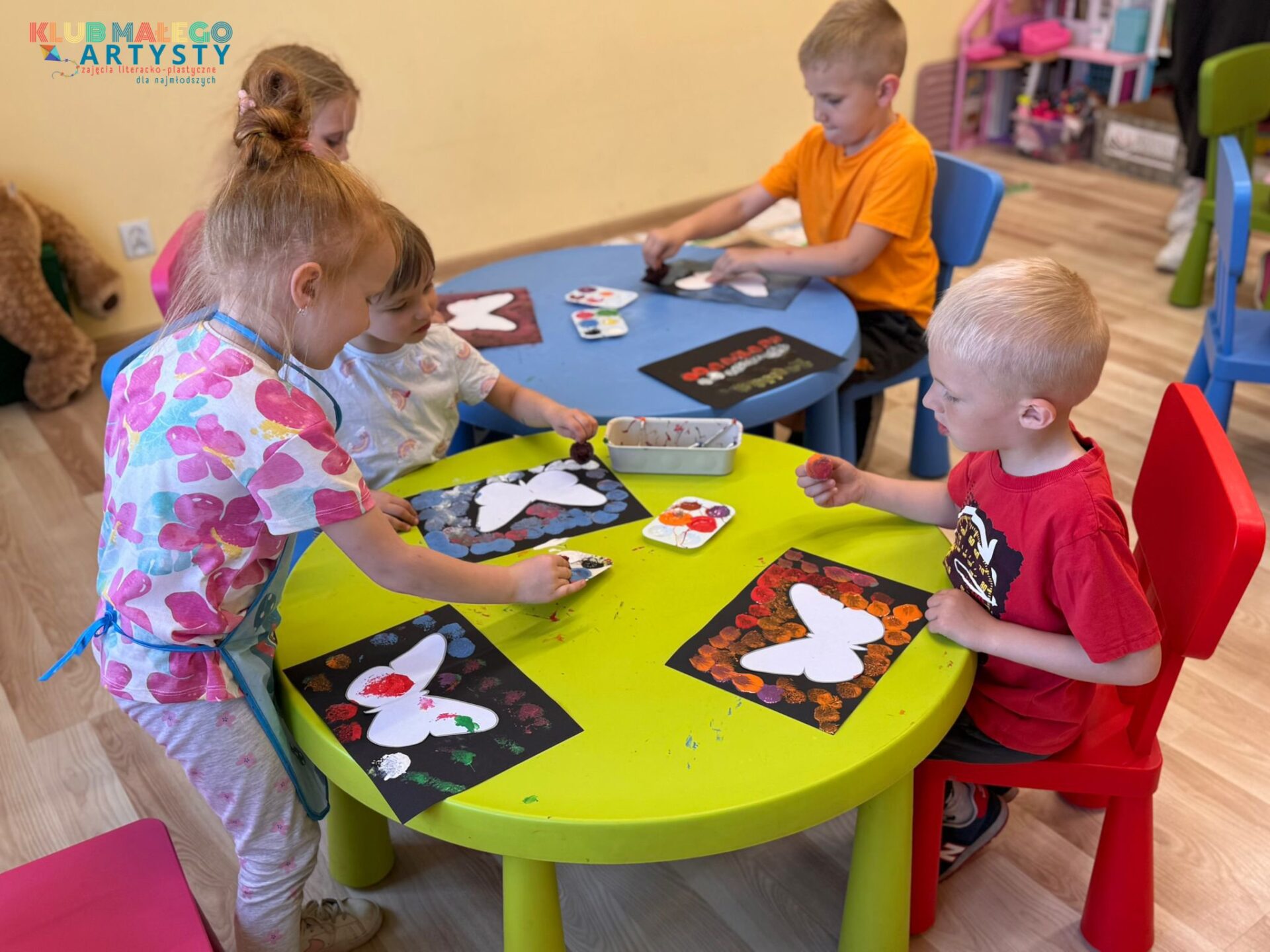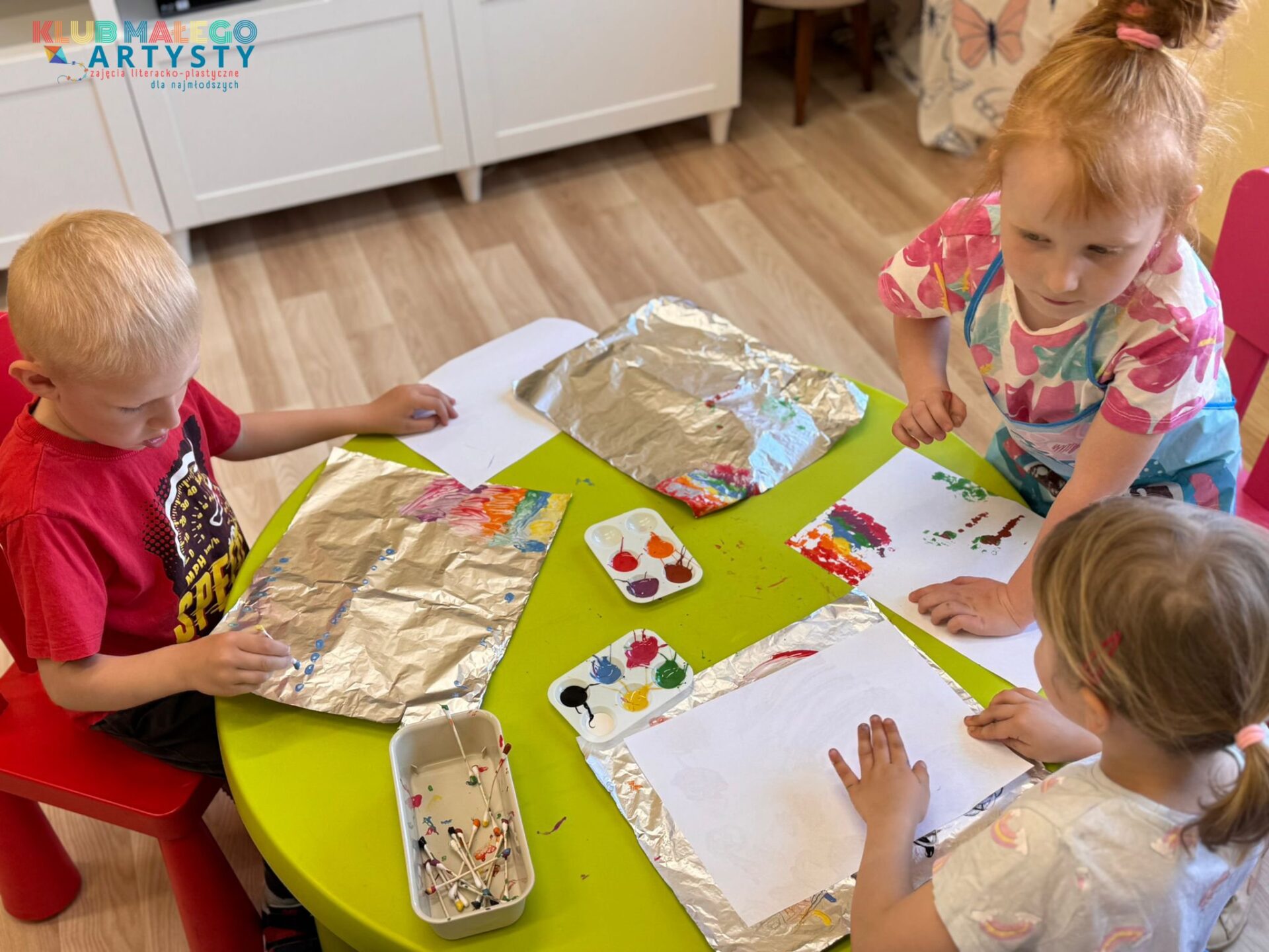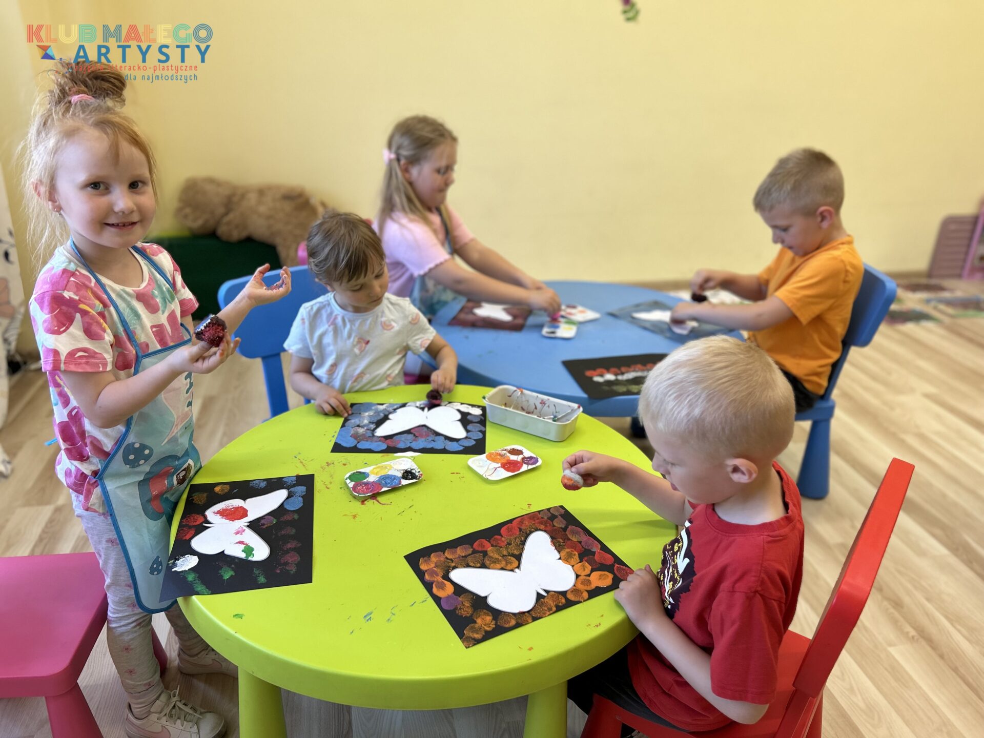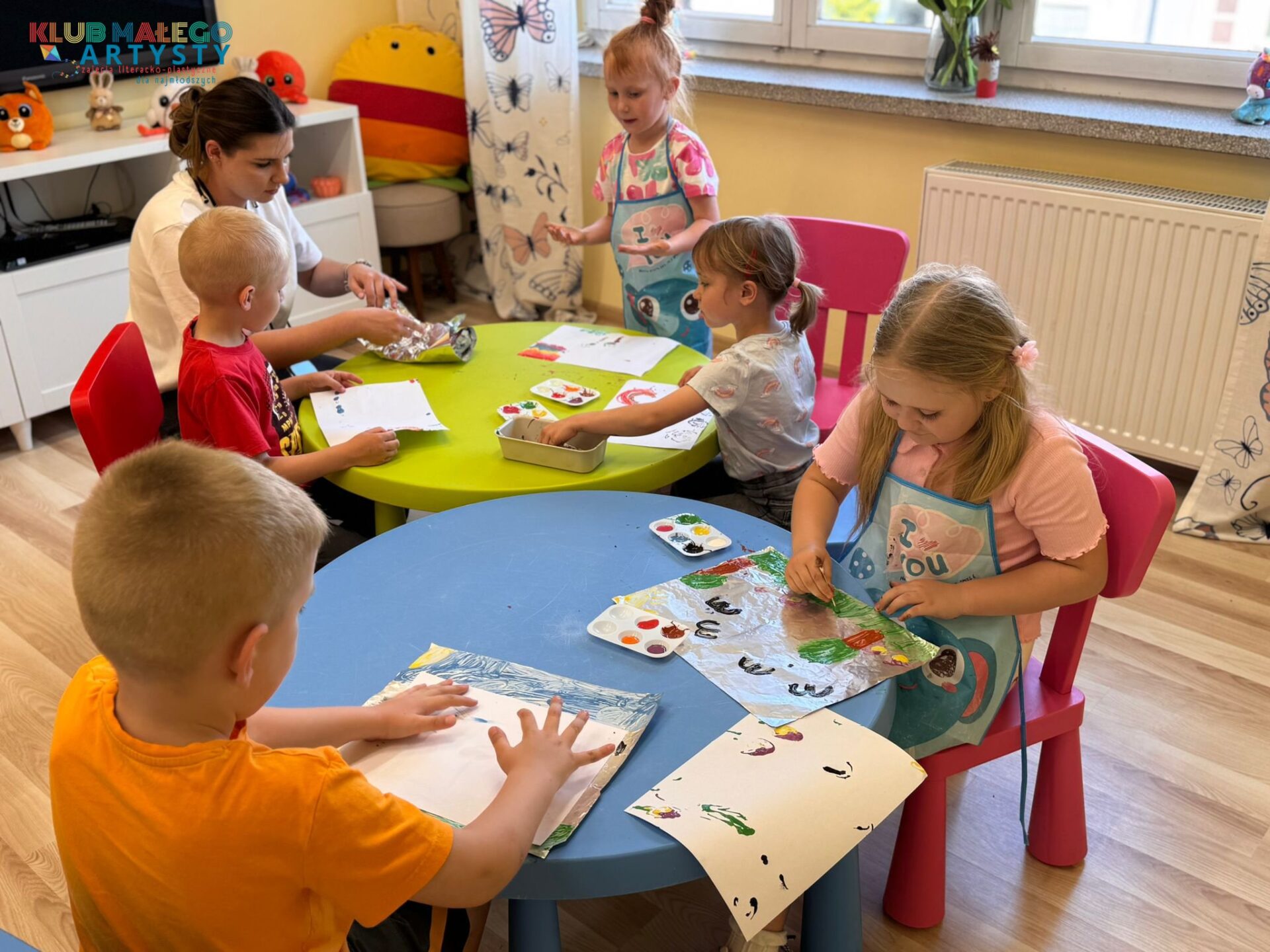 04.06.2025 r. zajęcia Klubu Małego Artysty były pełne kolorów! Tym razem malowaliśmy farbami w nieco inny, bardzo ciekawy sposób. Zamiast tradycyjnych pędzli, sięgnęliśmy po… patyczki i pompony! Dzieci tworzyły swoje kolorowe kompozycje, malując bezpośrednio na folii, a następnie odbijały swoje dzieła na kartkach papieru.