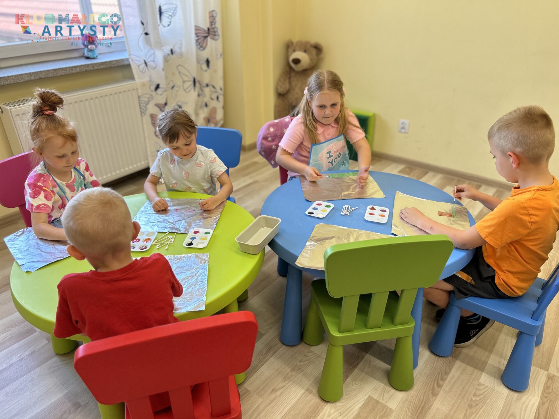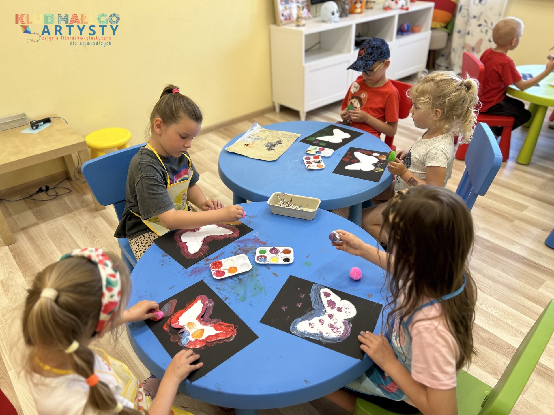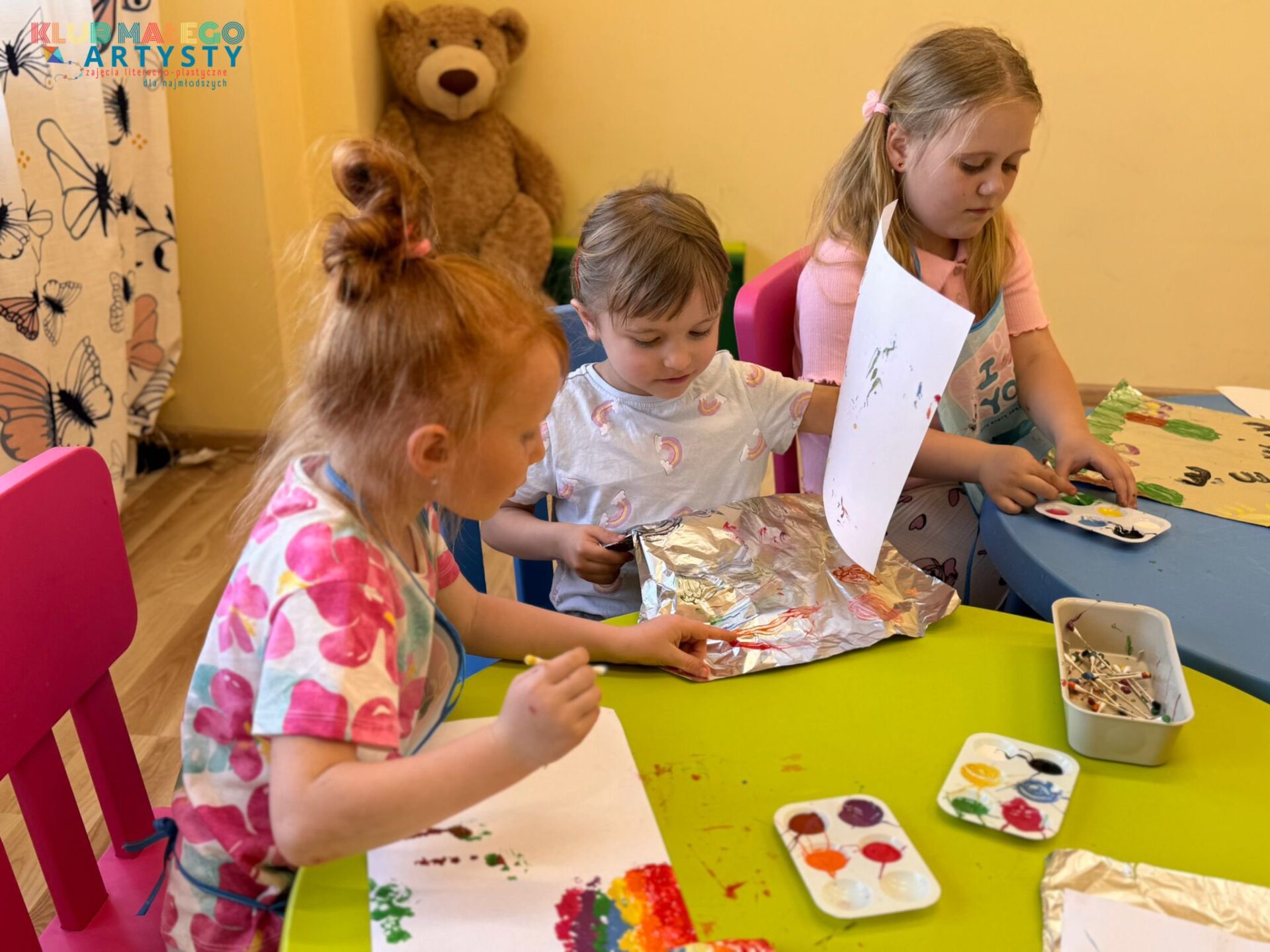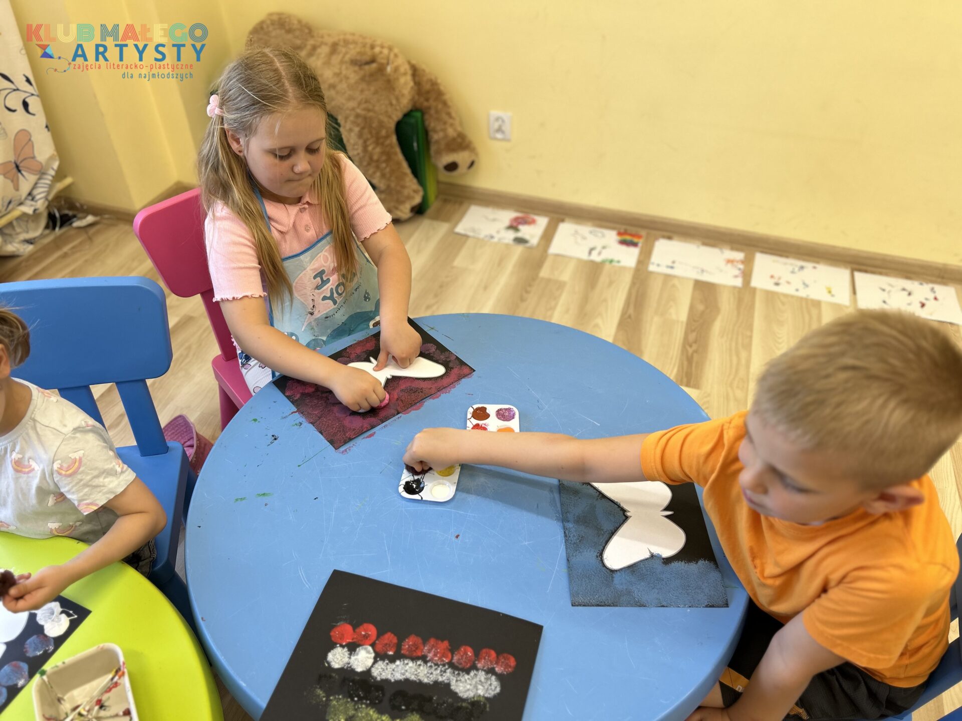 04.06.2025 r. zajęcia Klubu Małego Artysty były pełne kolorów! Tym razem malowaliśmy farbami w nieco inny, bardzo ciekawy sposób. Zamiast tradycyjnych pędzli, sięgnęliśmy po… patyczki i pompony! Dzieci tworzyły swoje kolorowe kompozycje, malując bezpośrednio na folii, a następnie odbijały swoje dzieła na kartkach papieru.