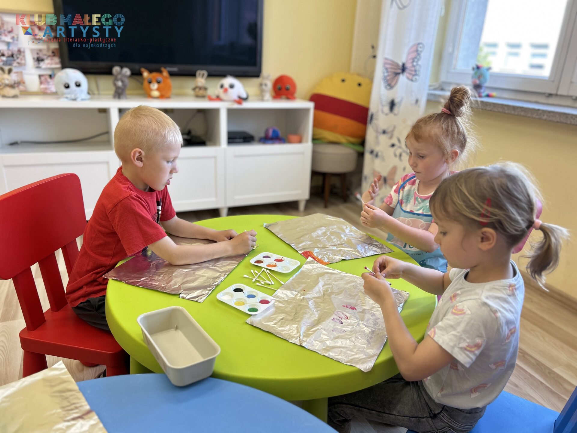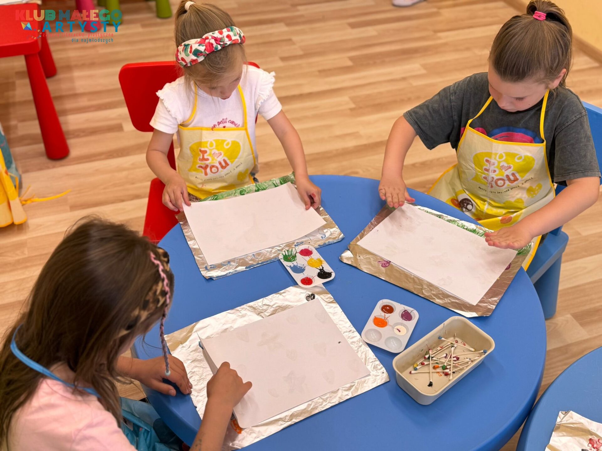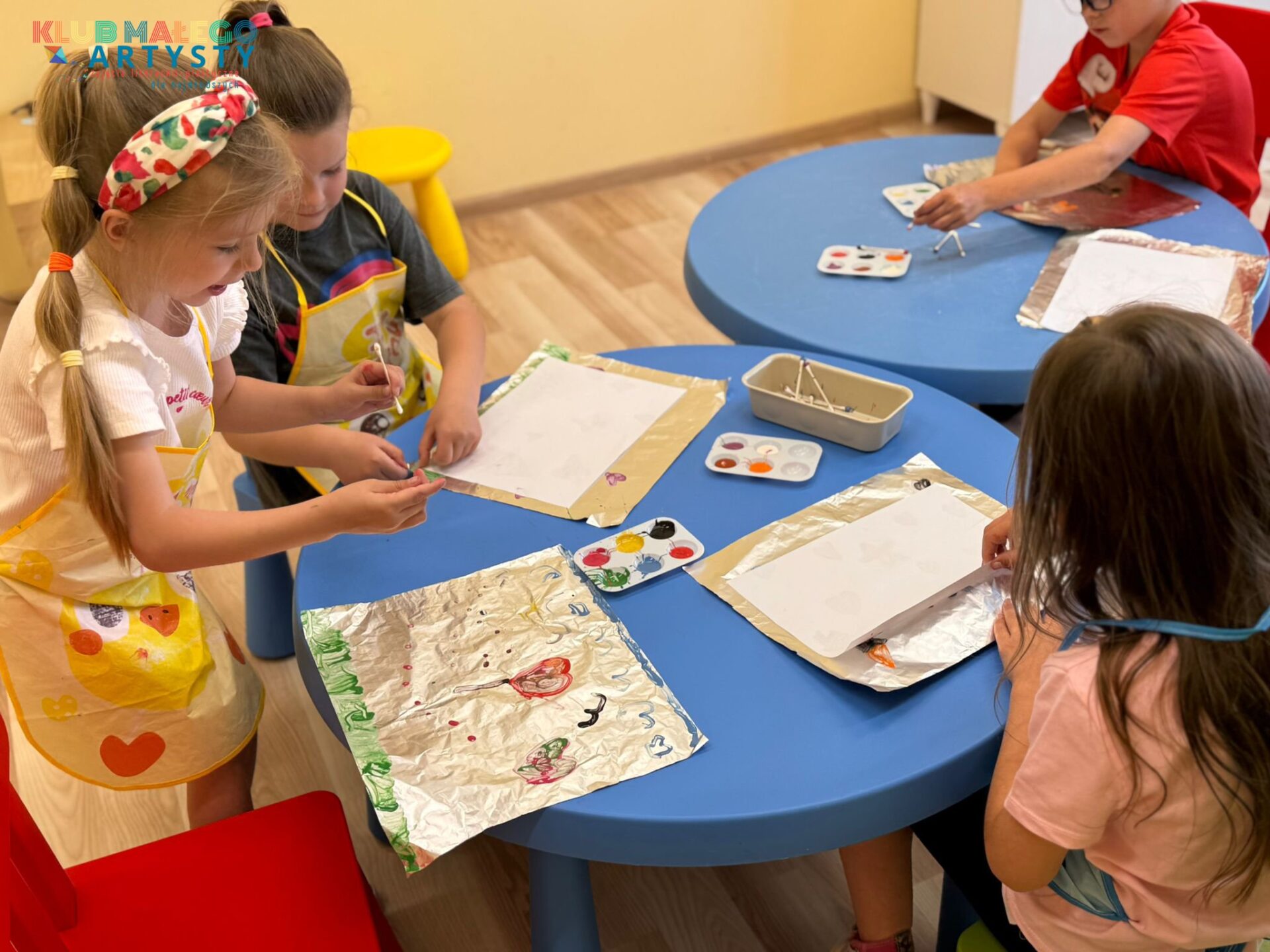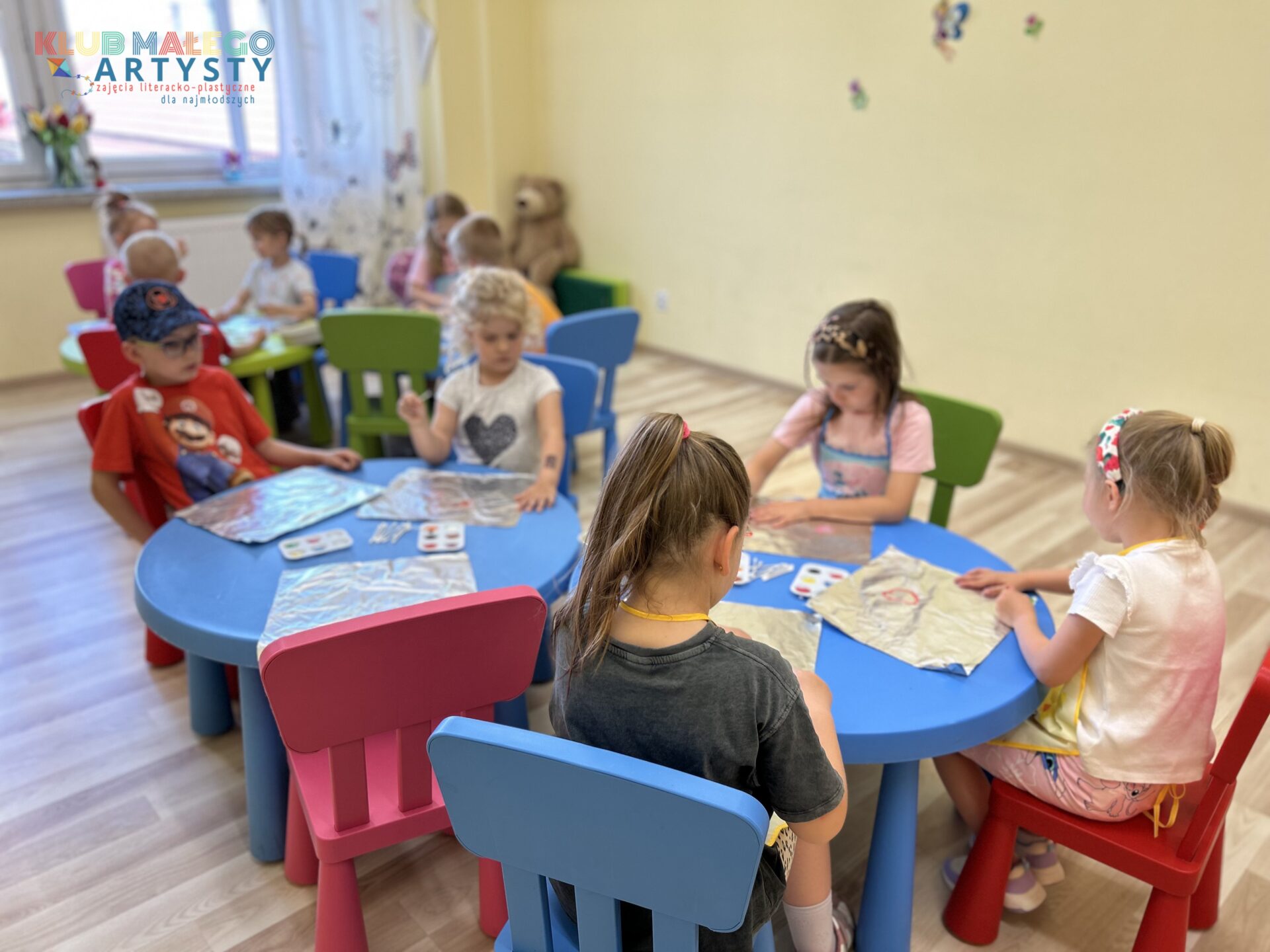 04.06.2025 r. zajęcia Klubu Małego Artysty były pełne kolorów! Tym razem malowaliśmy farbami w nieco inny, bardzo ciekawy sposób. Zamiast tradycyjnych pędzli, sięgnęliśmy po… patyczki i pompony! Dzieci tworzyły swoje kolorowe kompozycje, malując bezpośrednio na folii, a następnie odbijały swoje dzieła na kartkach papieru.