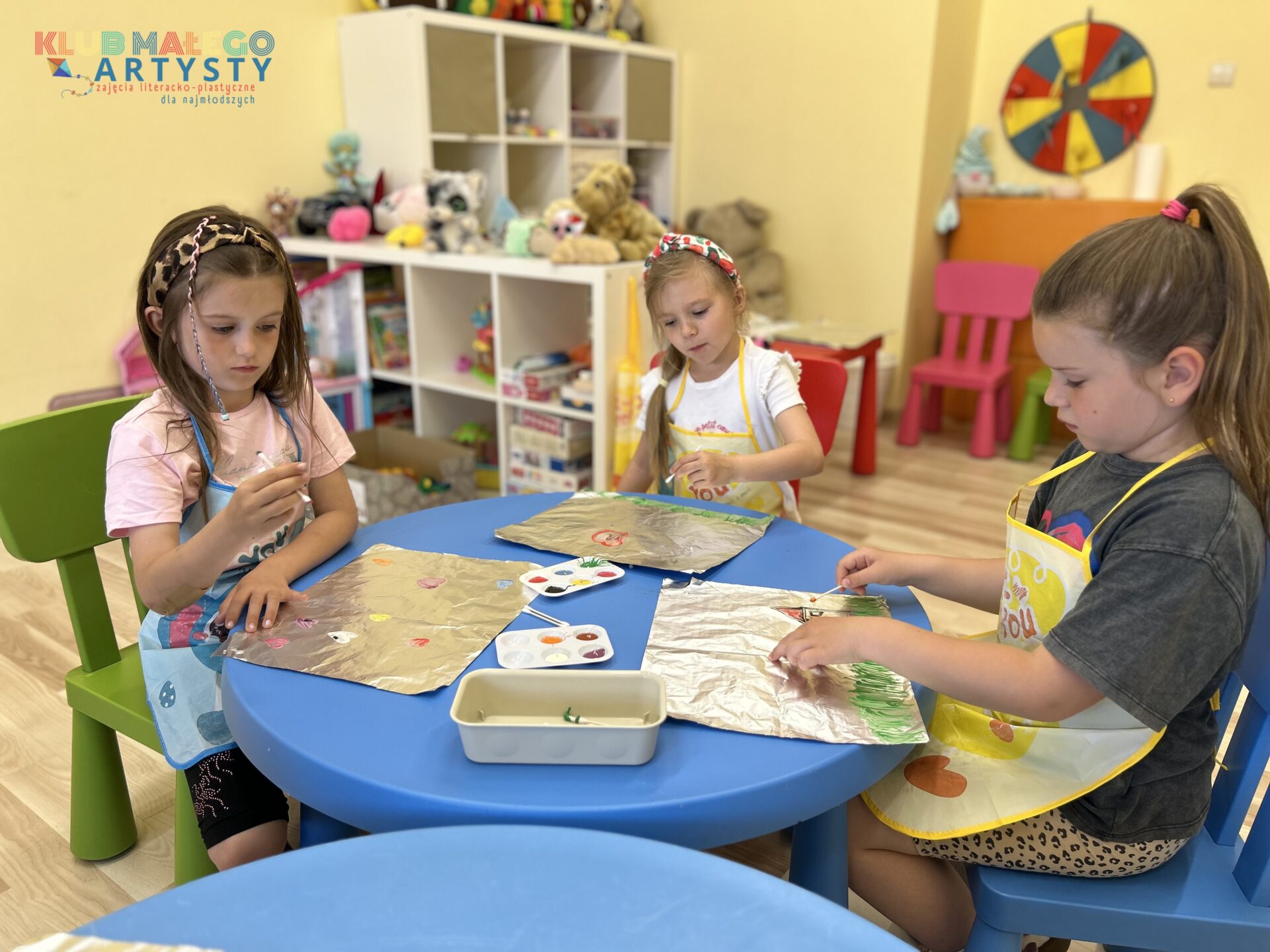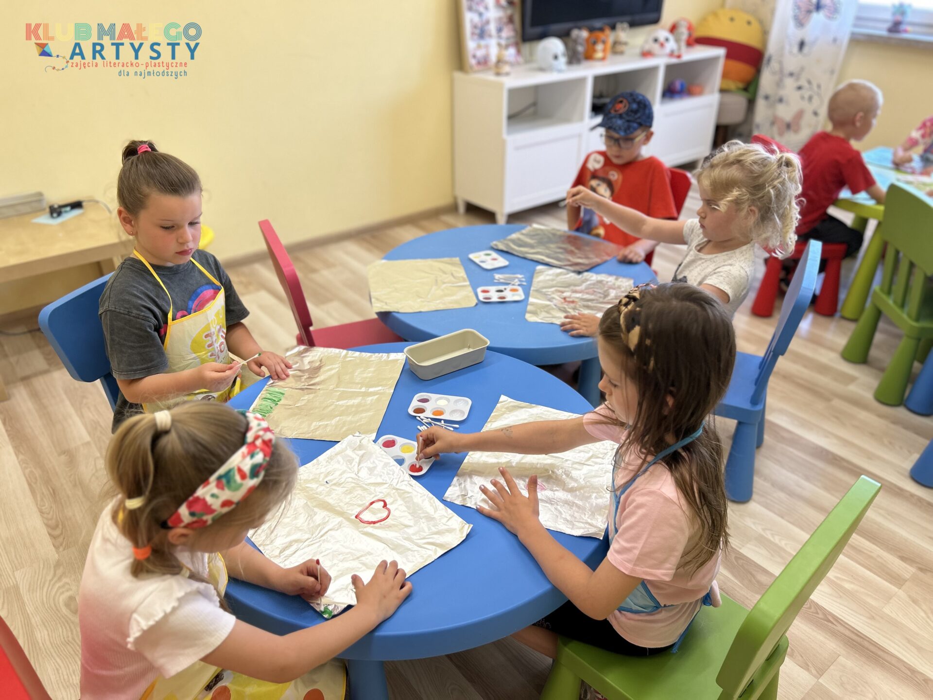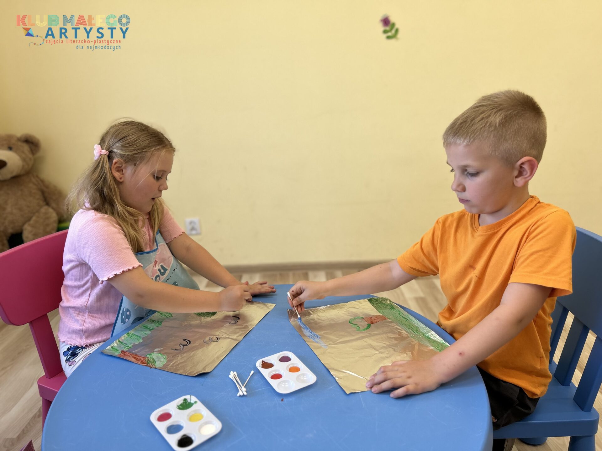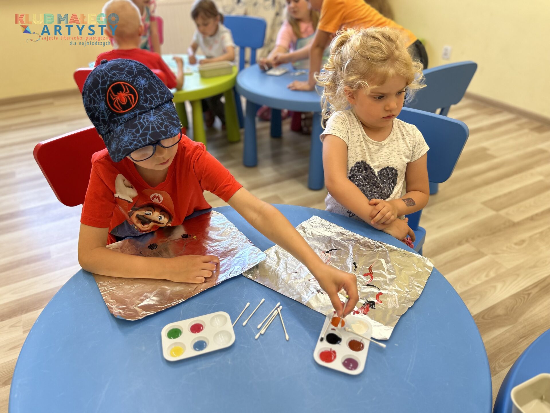 04.06.2025 r. zajęcia Klubu Małego Artysty były pełne kolorów! Tym razem malowaliśmy farbami w nieco inny, bardzo ciekawy sposób. Zamiast tradycyjnych pędzli, sięgnęliśmy po… patyczki i pompony! Dzieci tworzyły swoje kolorowe kompozycje, malując bezpośrednio na folii, a następnie odbijały swoje dzieła na kartkach papieru.