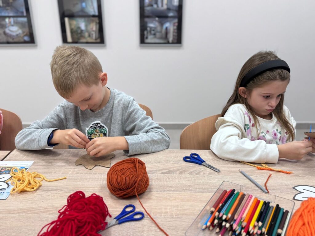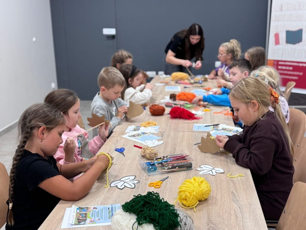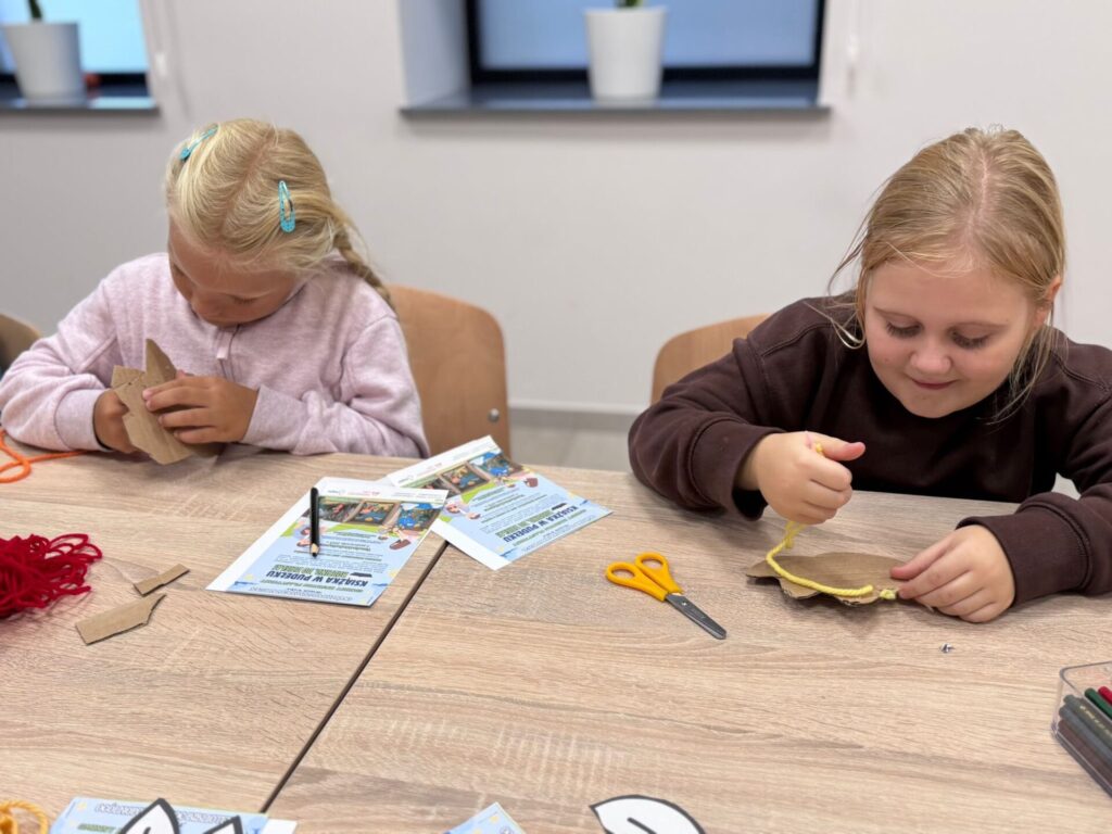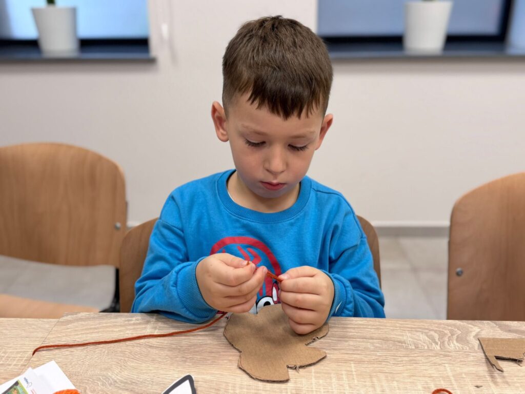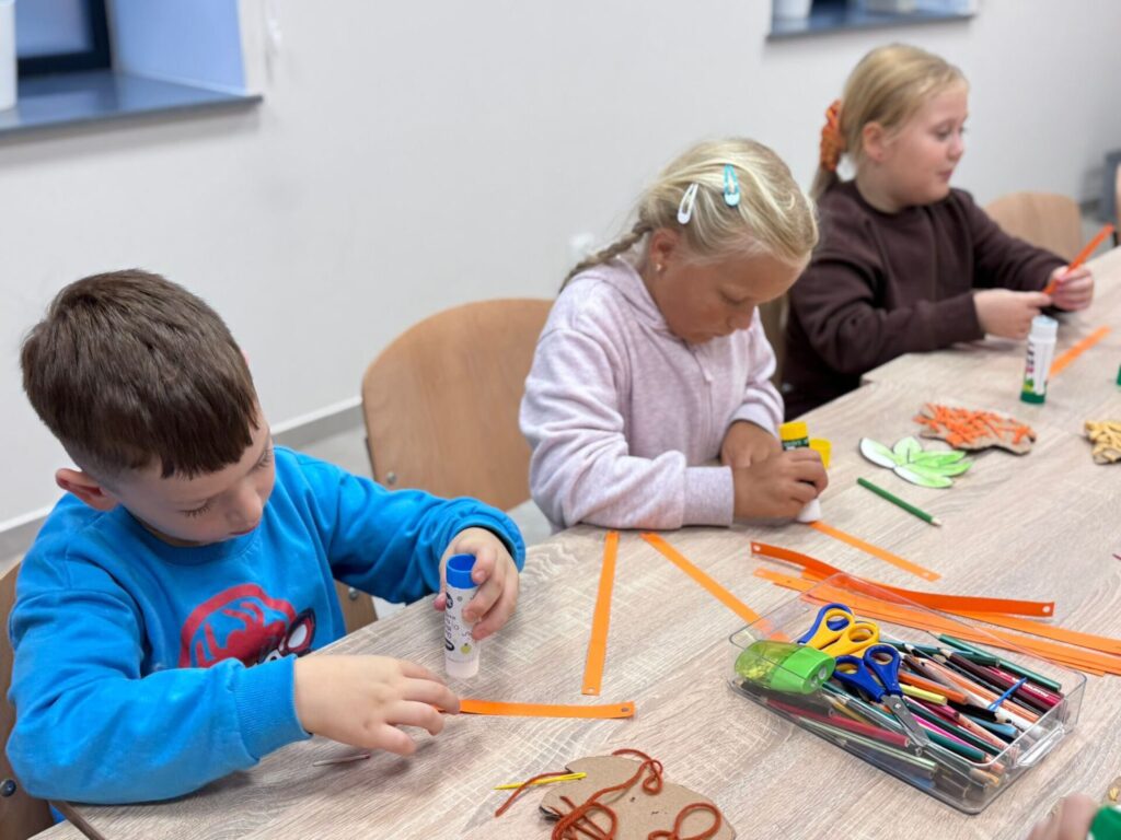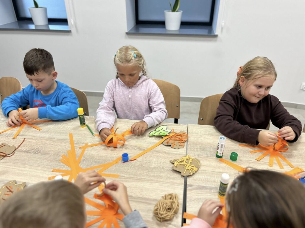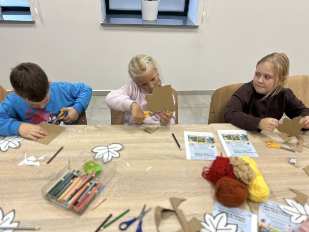 Dzieci z zapałem tworzyły jesienne liście z kartonu i kolorowej włóczki.