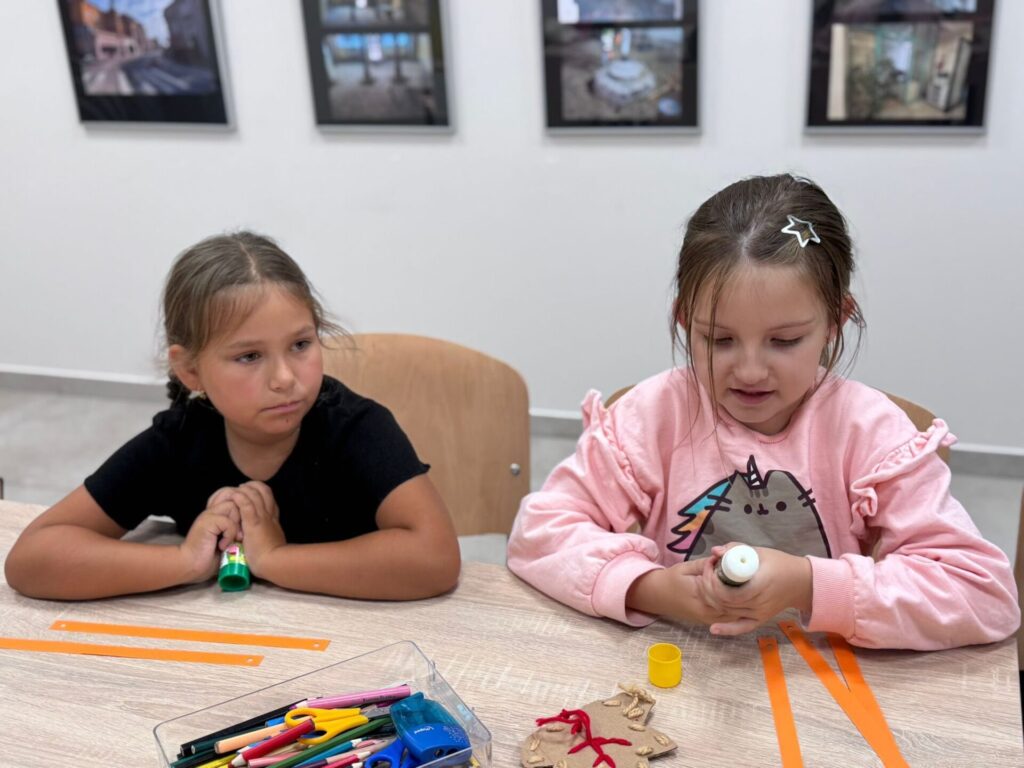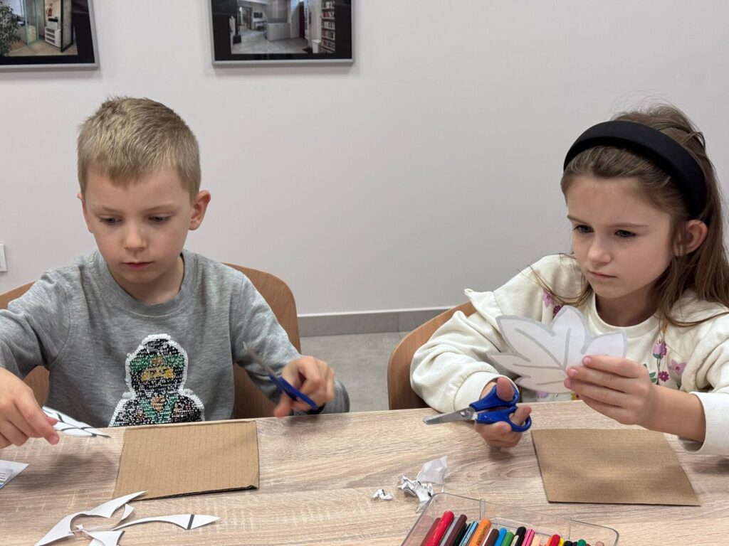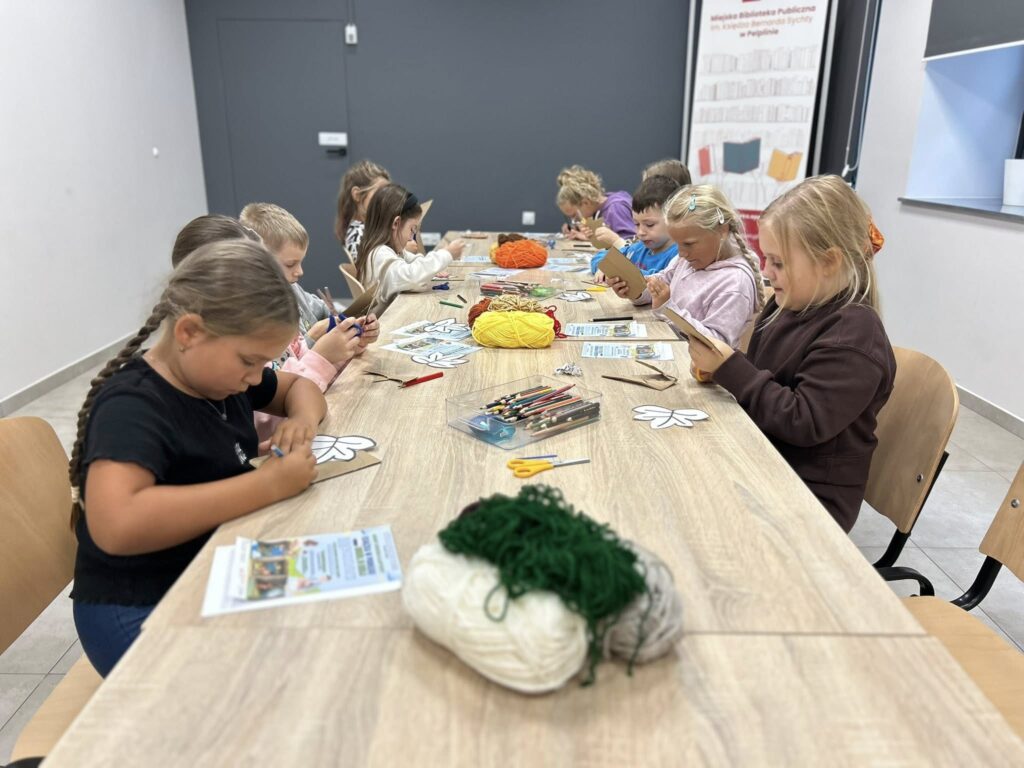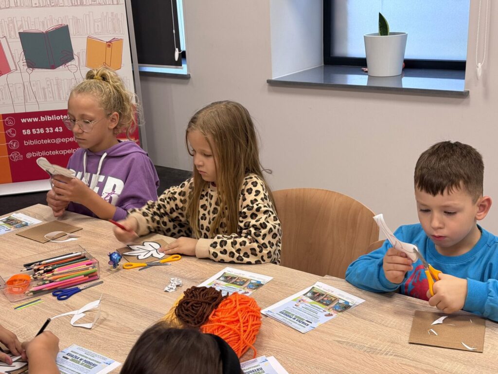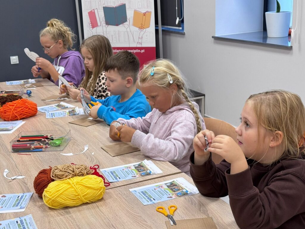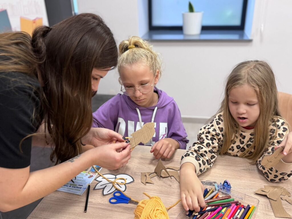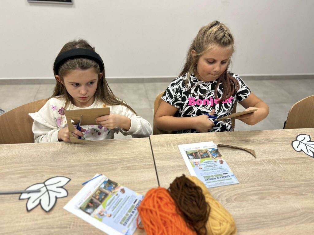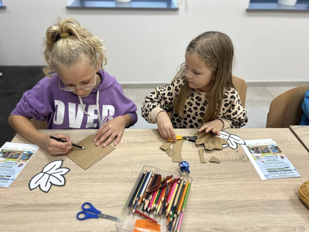 Dzieci z zapałem tworzyły jesienne liście z kartonu i kolorowej włóczki.