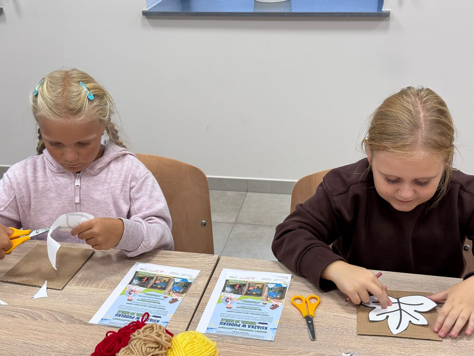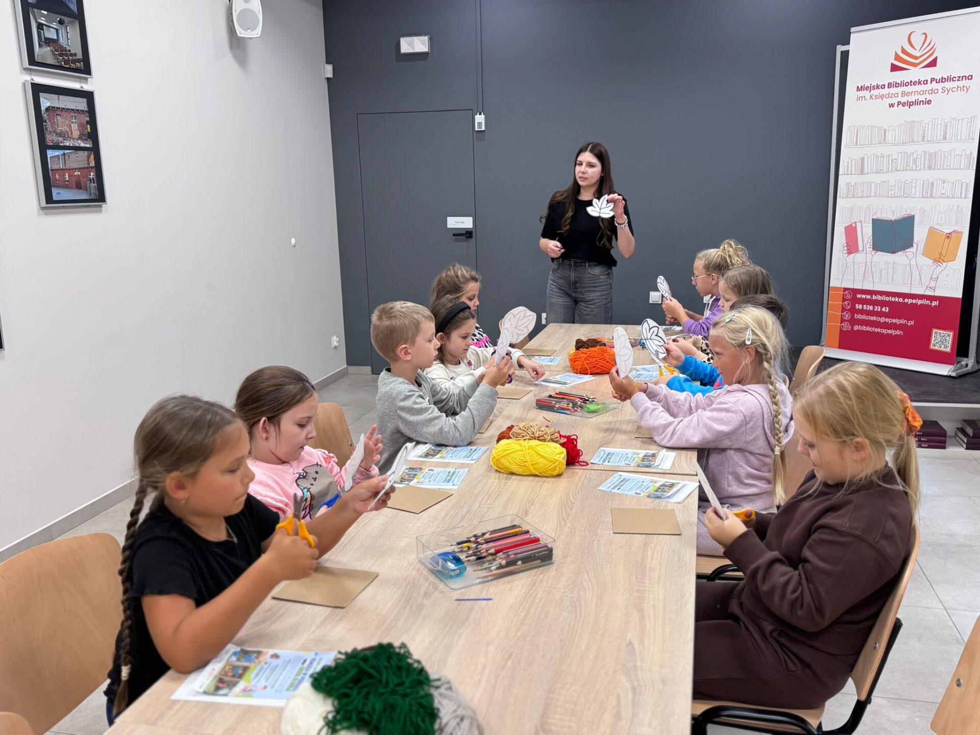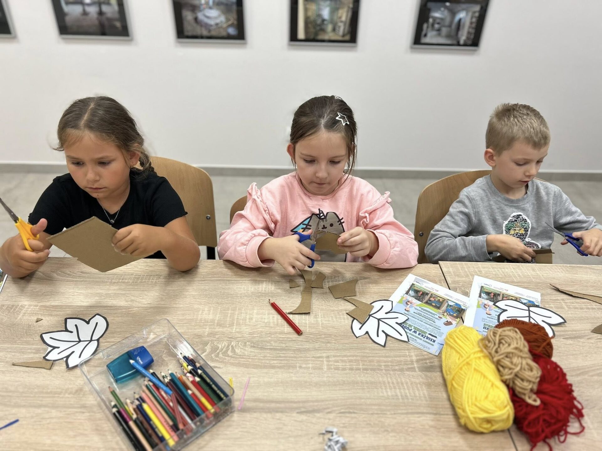 Dzieci z zapałem tworzyły jesienne liście z kartonu i kolorowej włóczki.