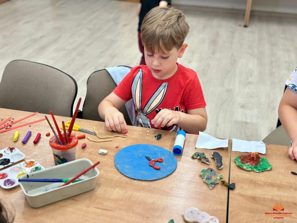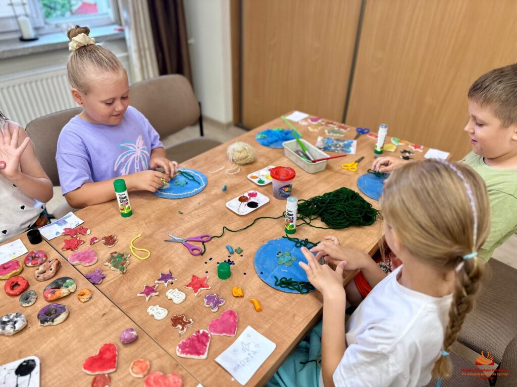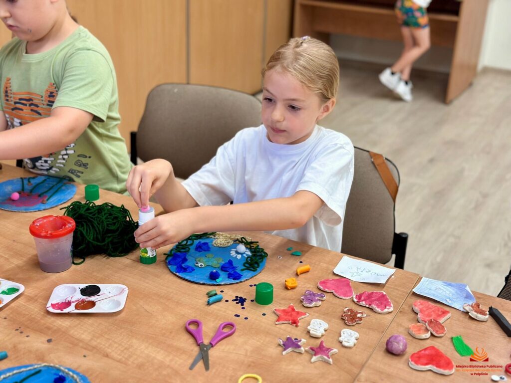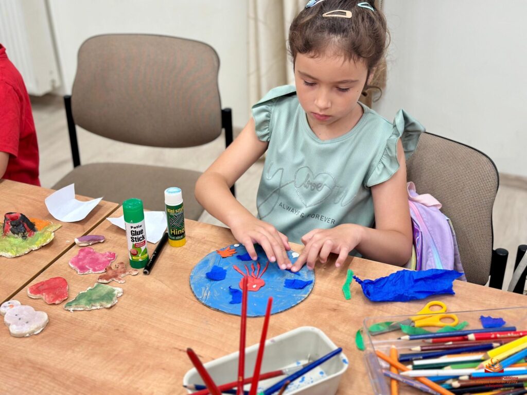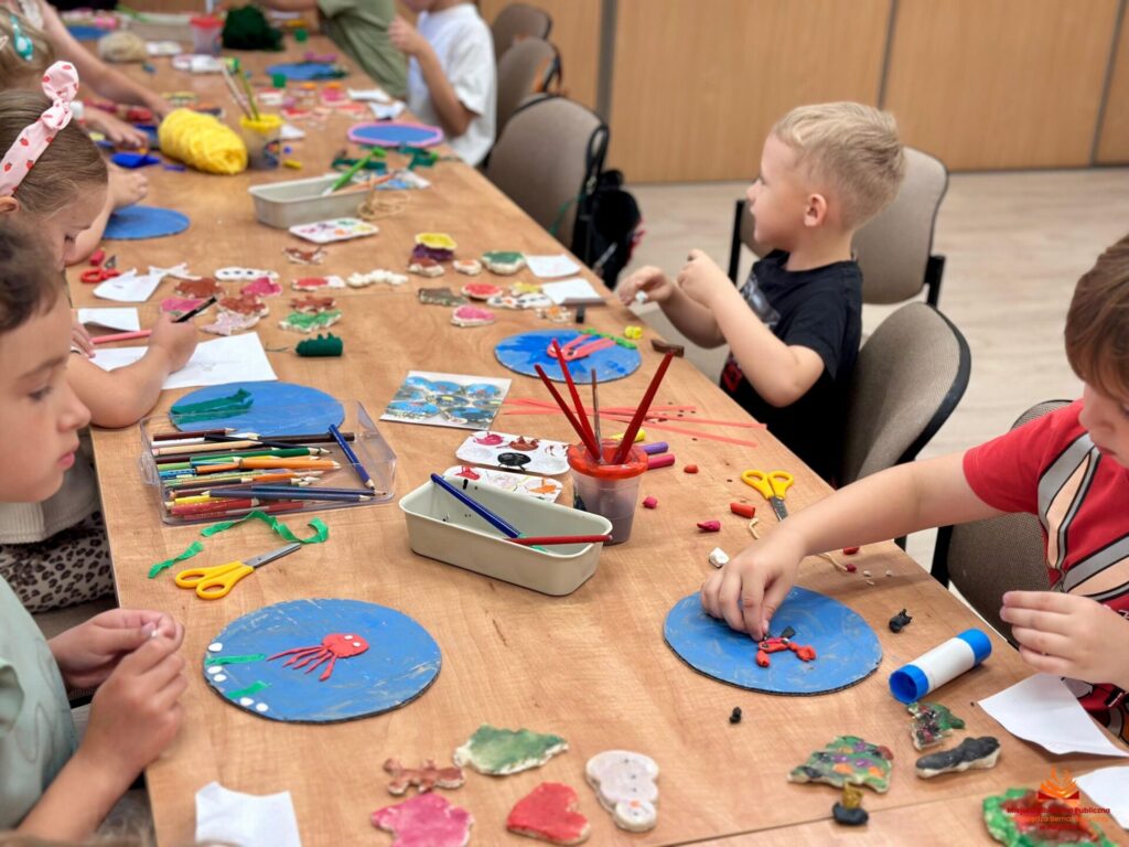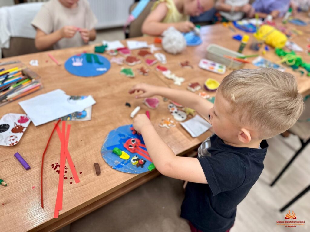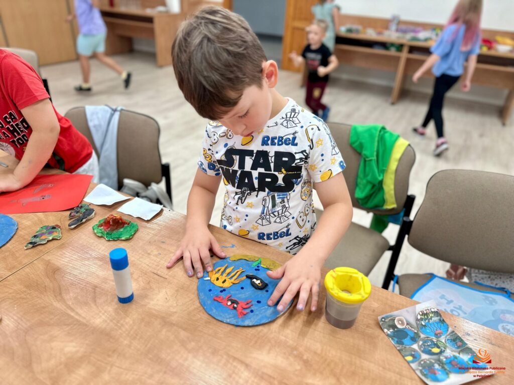 Na dzisiejszych zajęciach przenieśliśmy się do podwodnego świata! Dzieci tworzyły kolorowe oceany na kartonach – nie zabrakło ryb, meduz, ośmiornic i raf koralowych. Do dyspozycji były najróżniejsze materiały plastyczne: plastelina, druciki kreatywne, pompony, kolorowe kartki, bibuła i wiele innych ozdób, które pomogły tchnąć życie w podwodne krainy.
