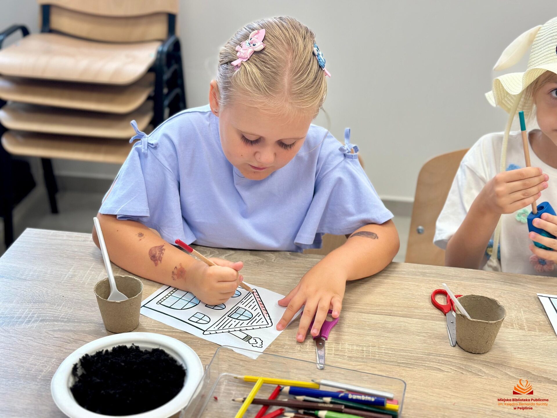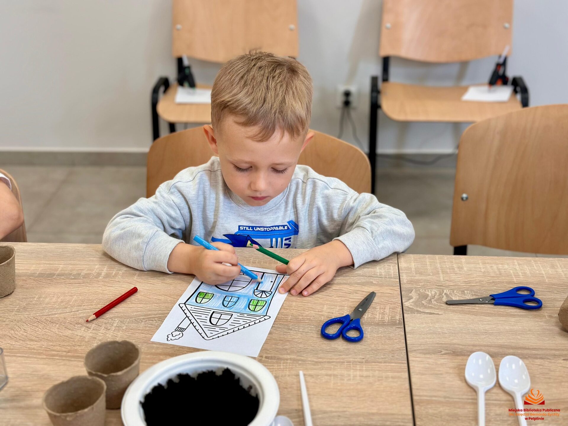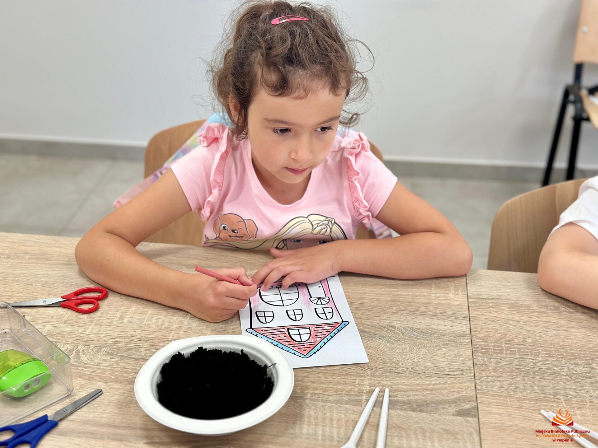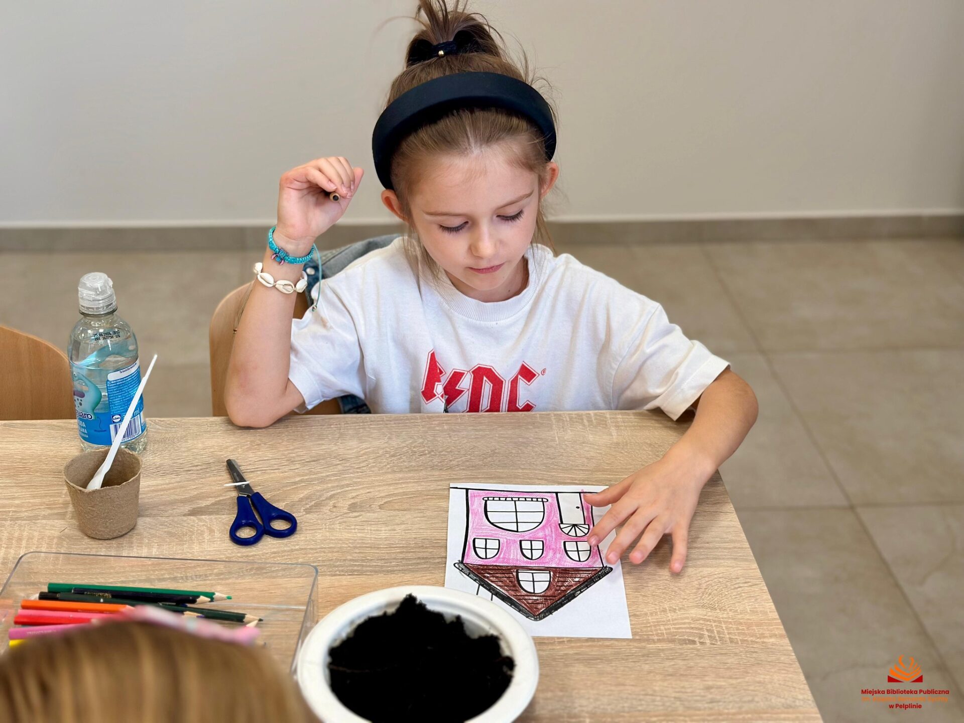 Na dzisiejszych zajęciach dzieci miały okazję połączyć twórczą zabawę z nauką o roślinach. Na początku każdy uczestnik kolorował swój papierowy domek.