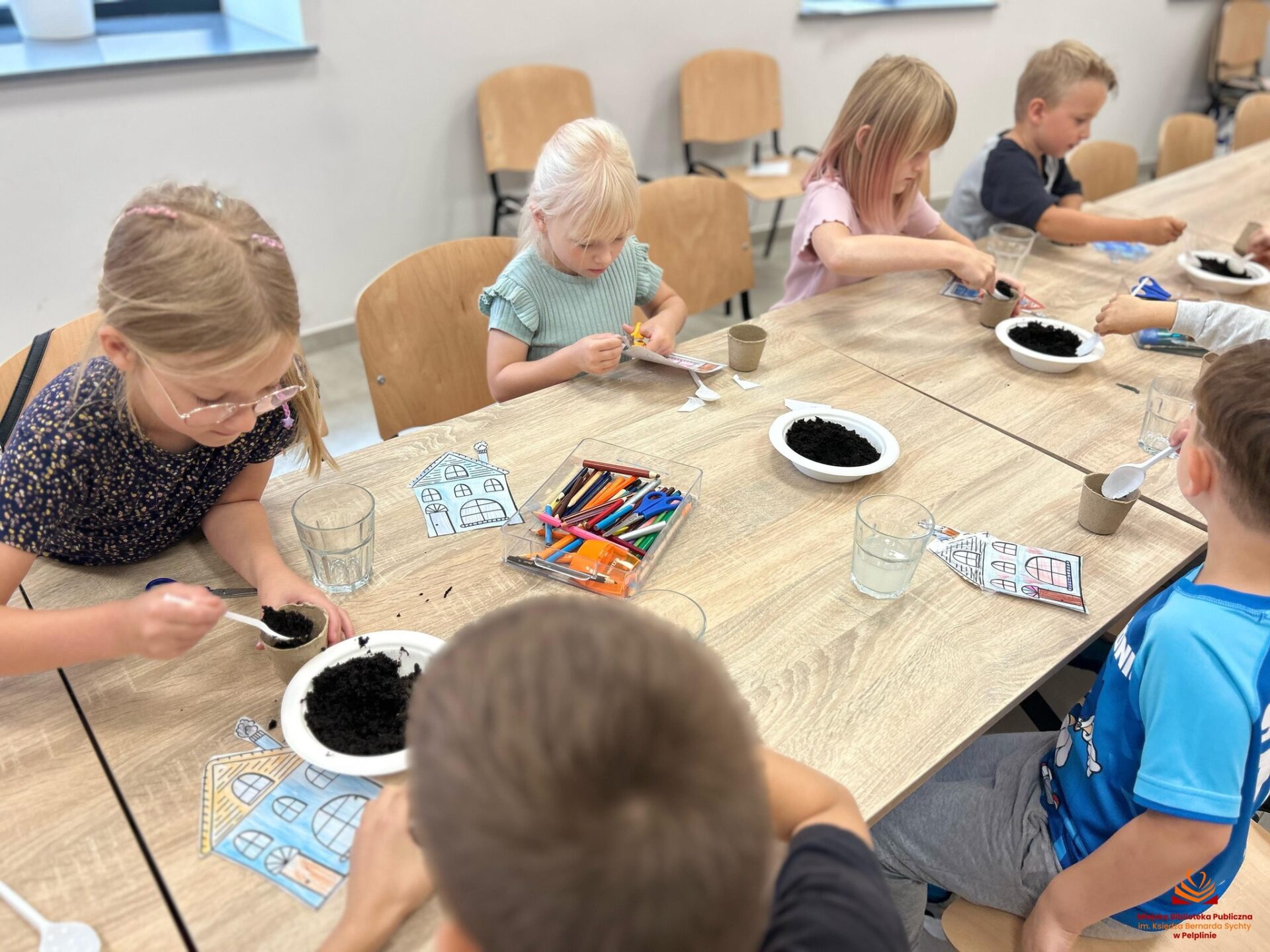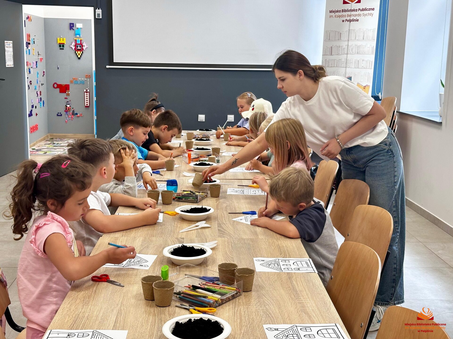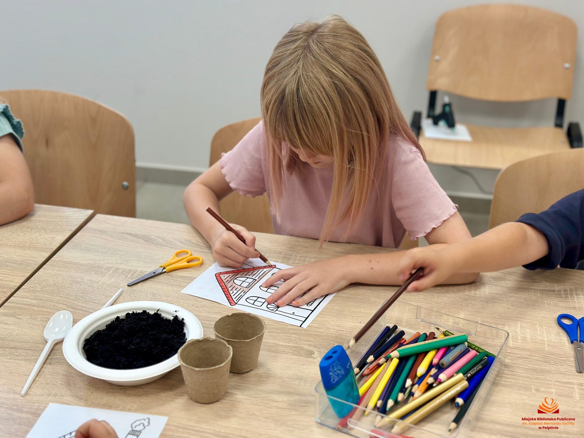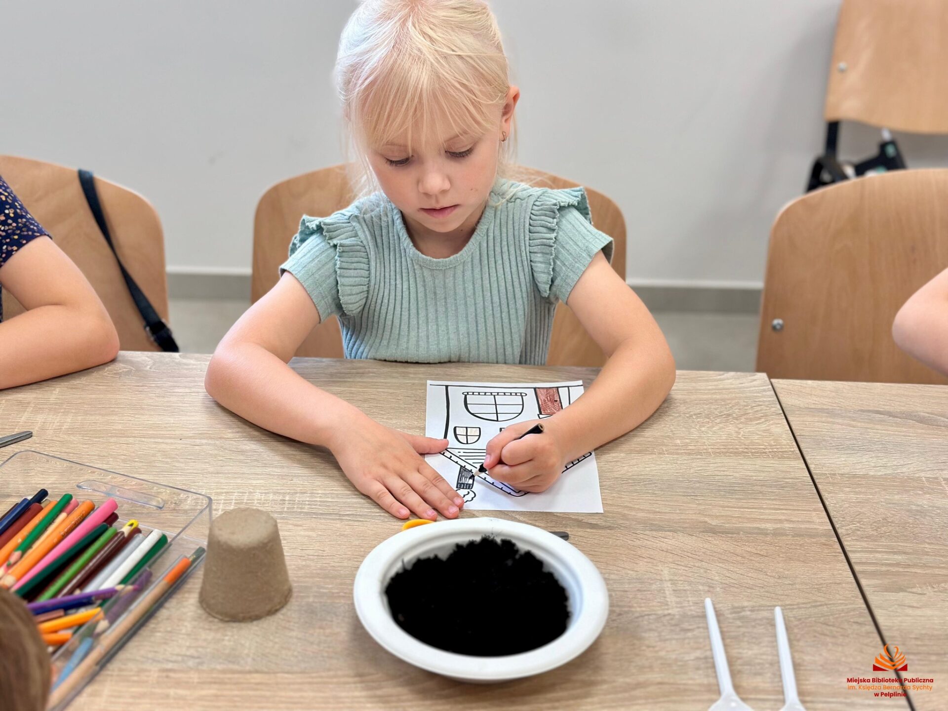 Na dzisiejszych zajęciach dzieci miały okazję połączyć twórczą zabawę z nauką o roślinach. Na początku każdy uczestnik kolorował swój papierowy domek.