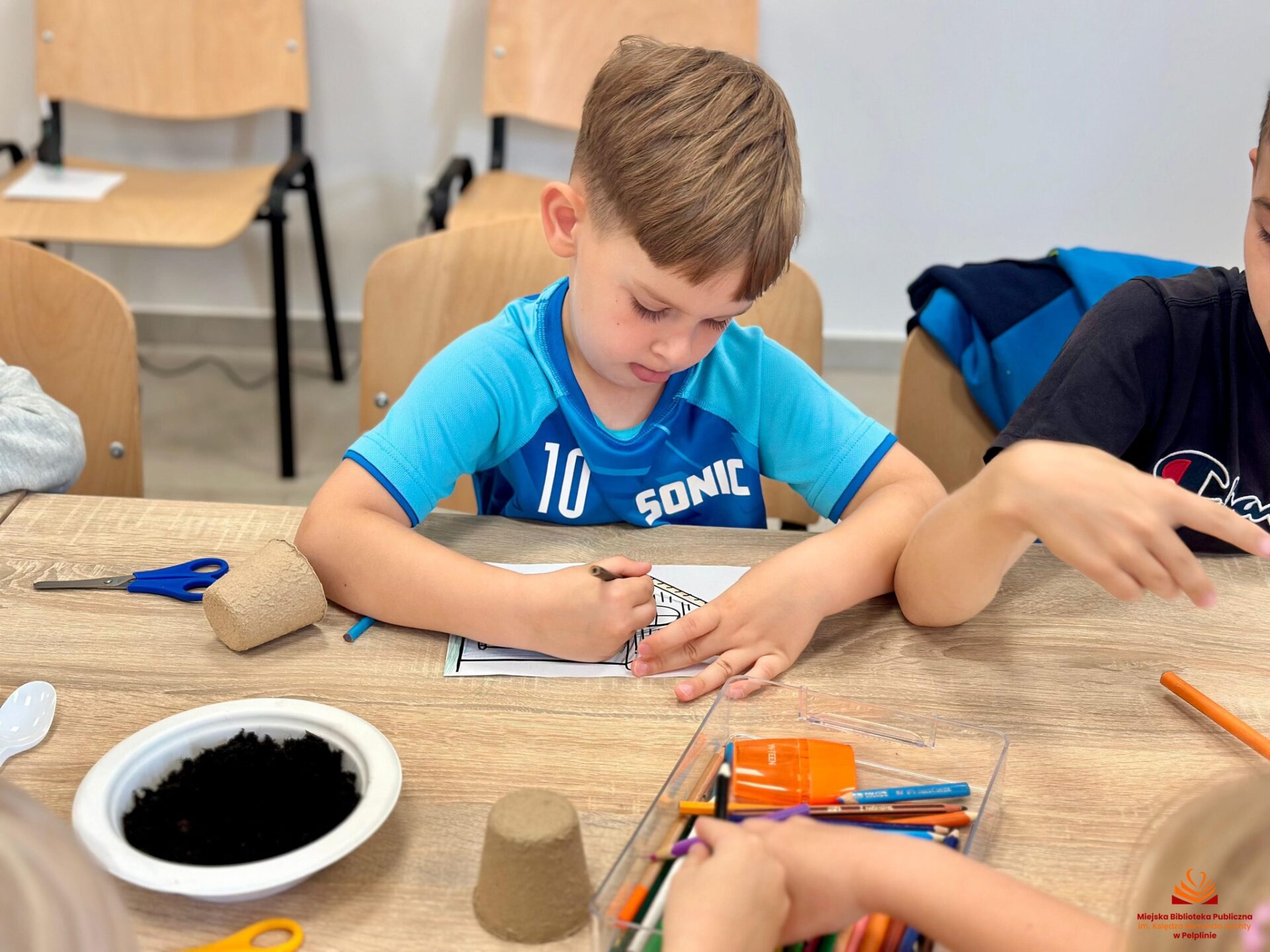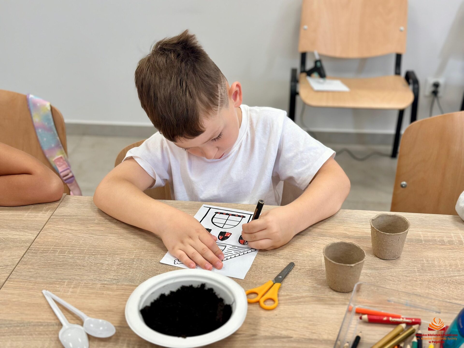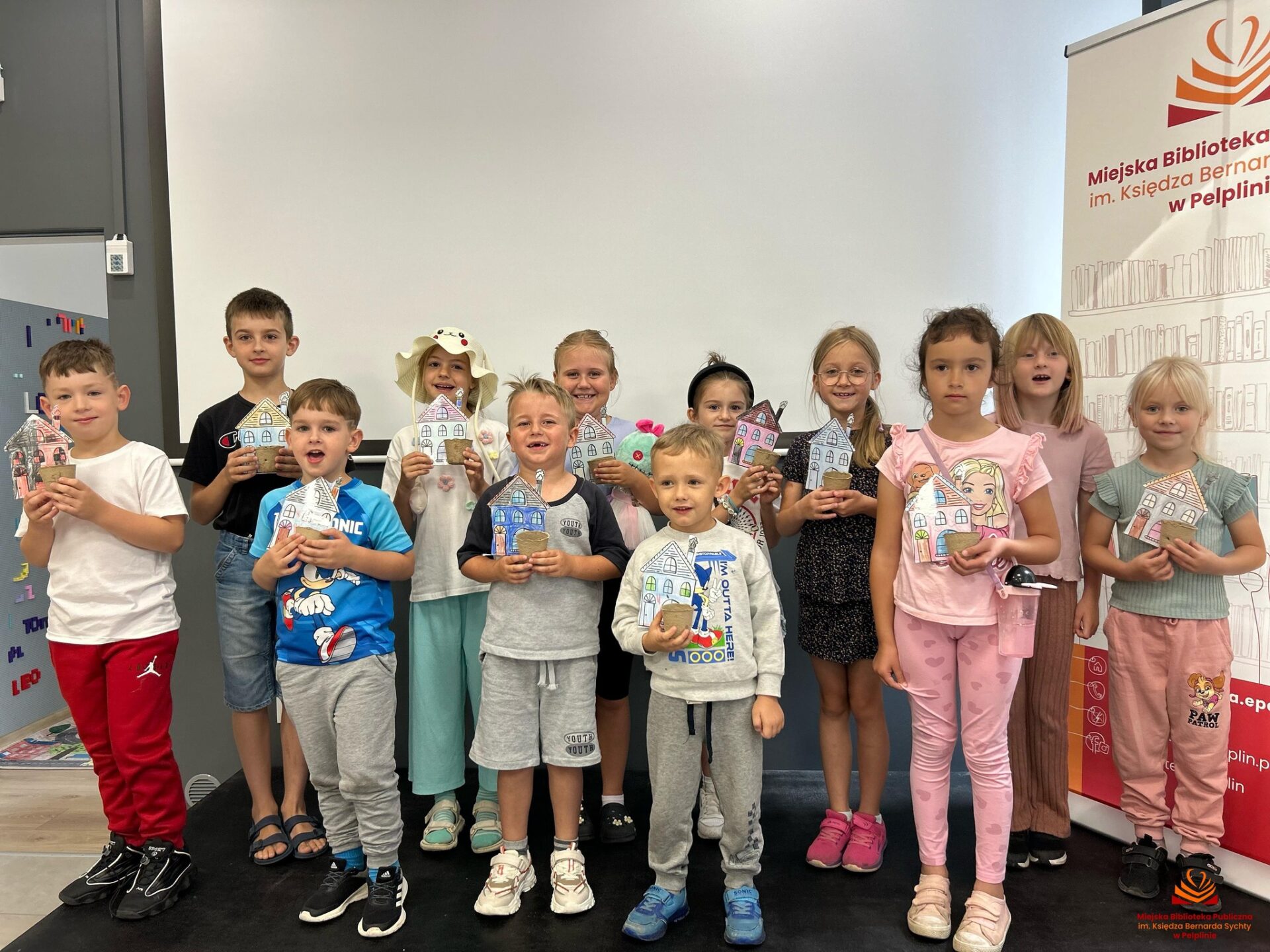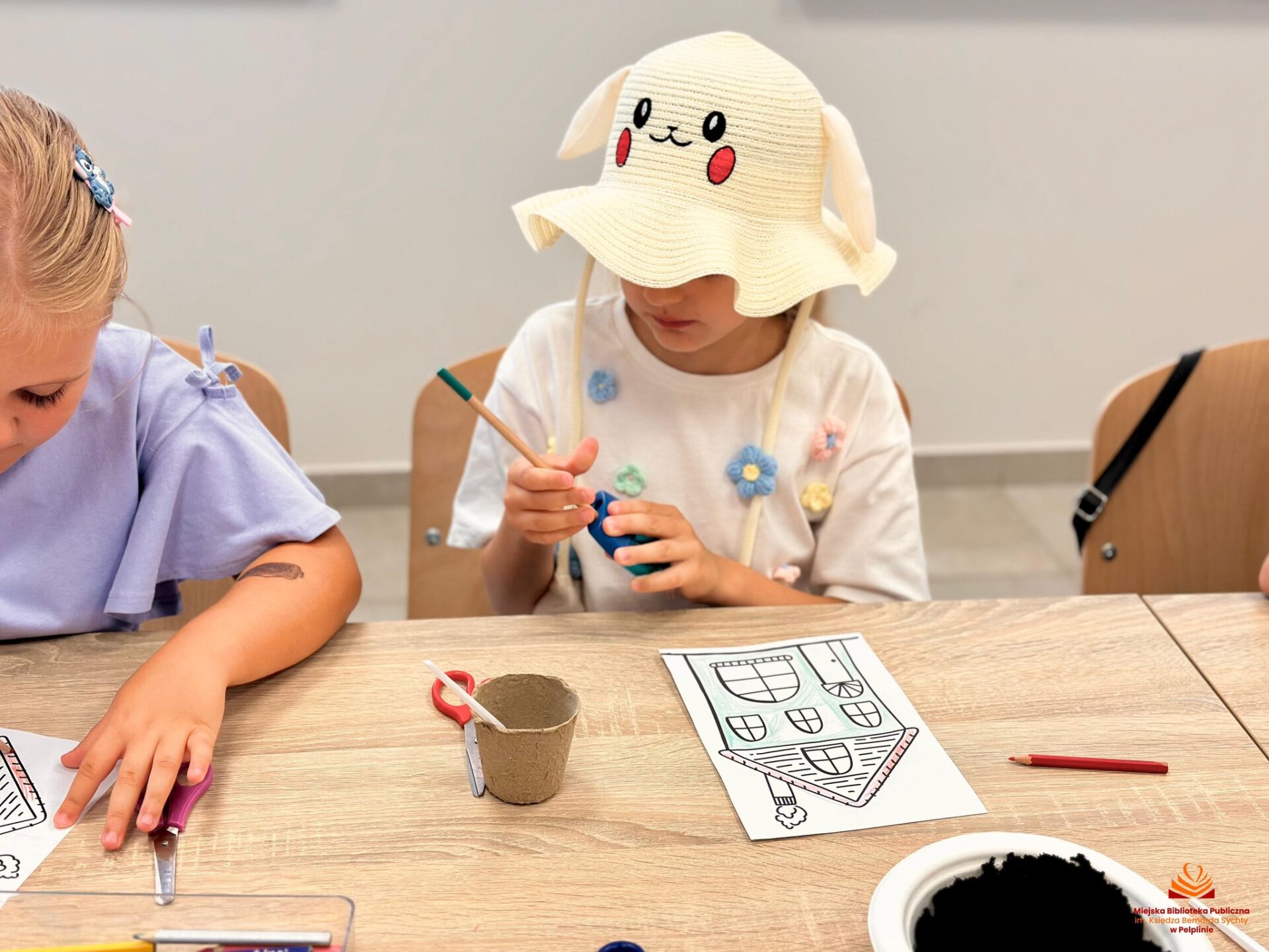 Na dzisiejszych zajęciach dzieci miały okazję połączyć twórczą zabawę z nauką o roślinach. Na początku każdy uczestnik kolorował swój papierowy domek.
