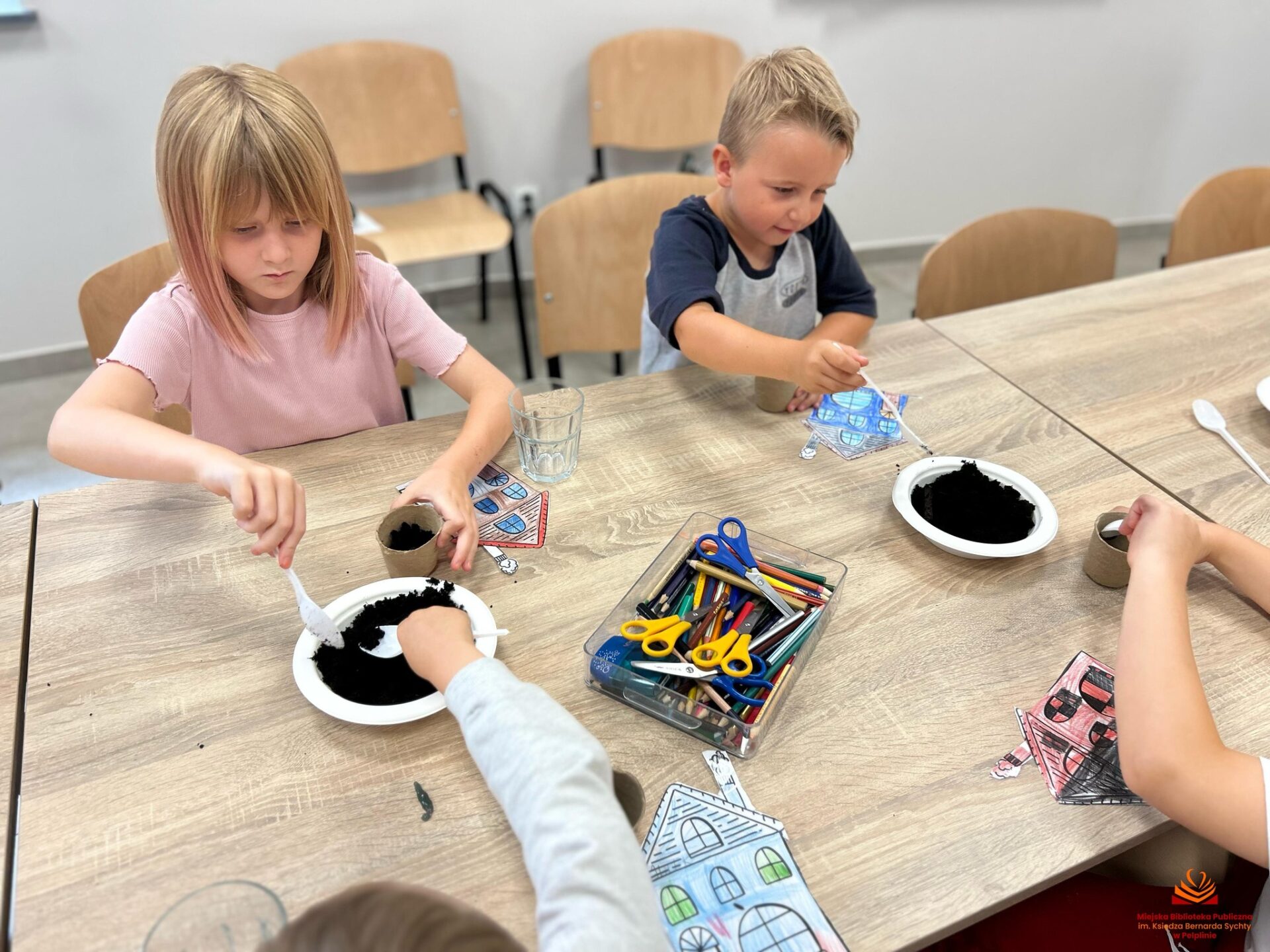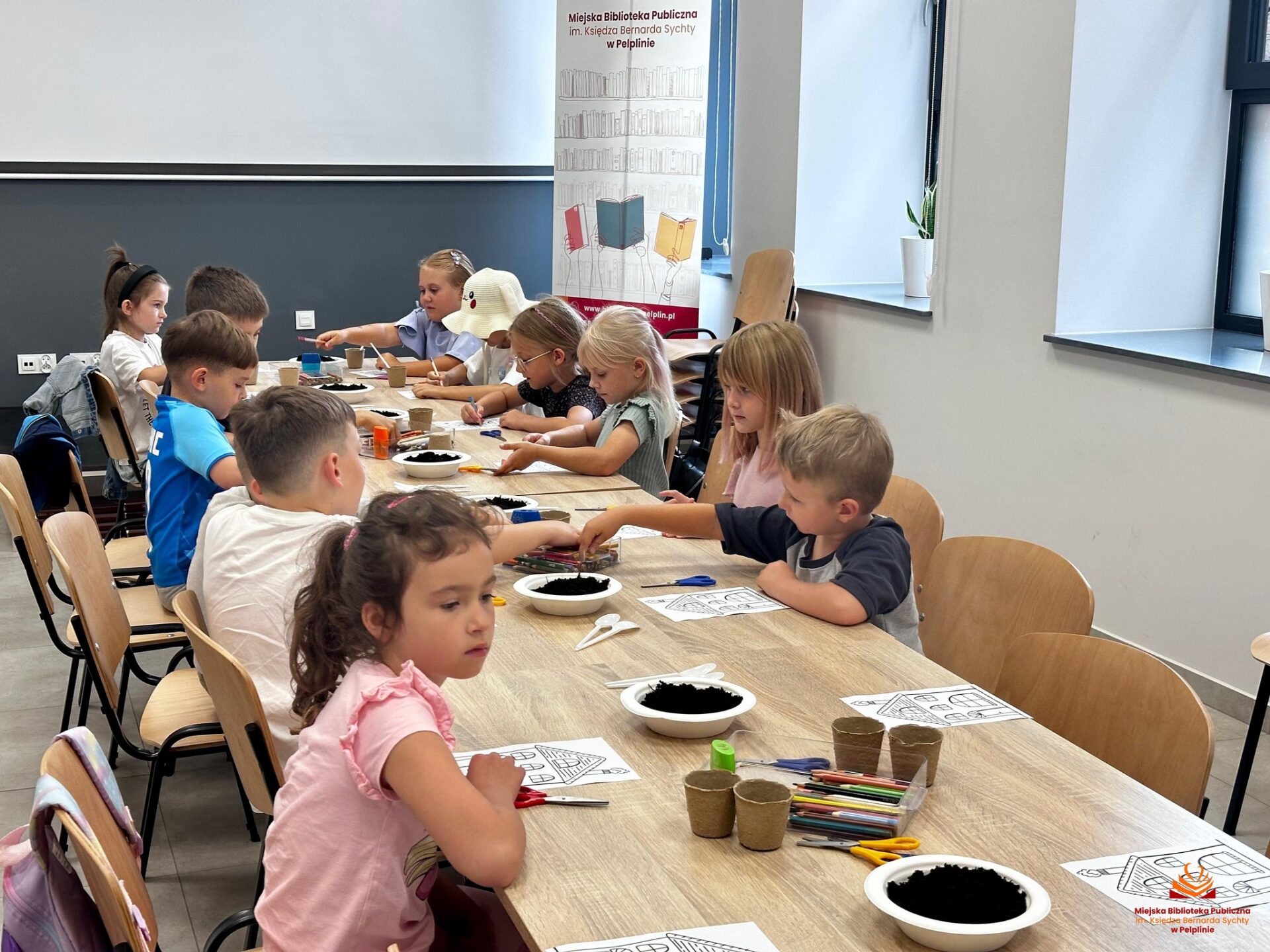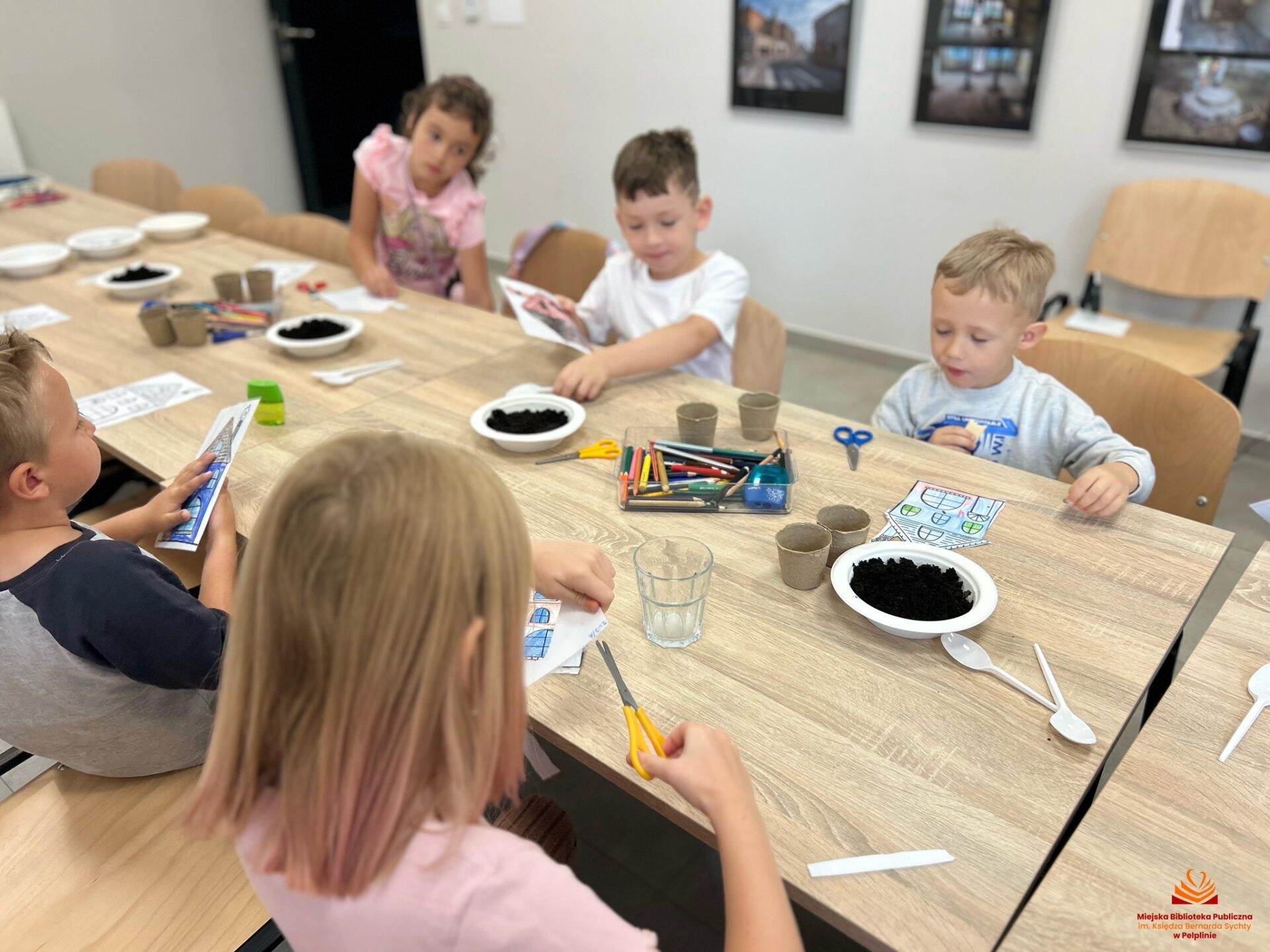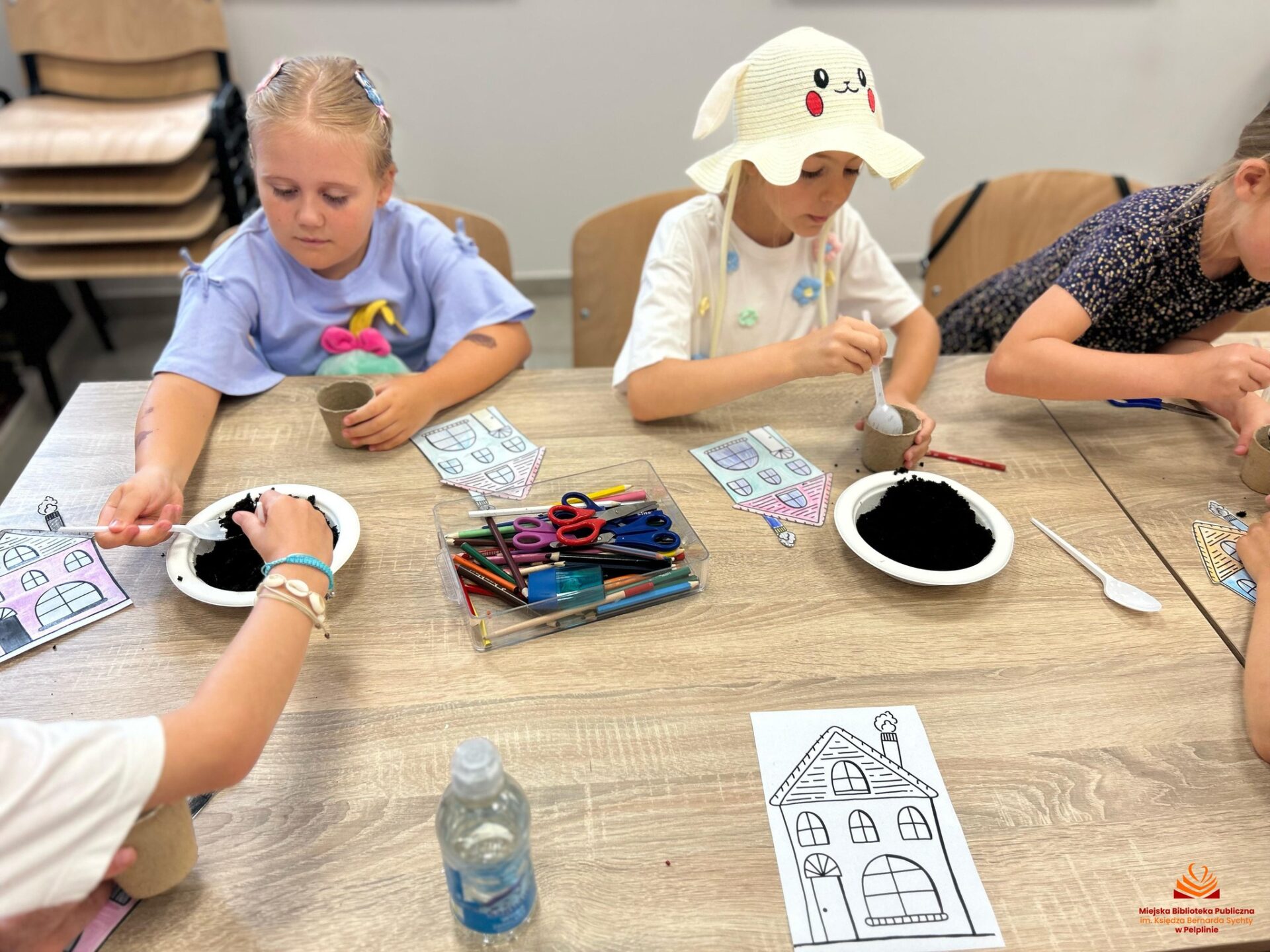 Na dzisiejszych zajęciach dzieci miały okazję połączyć twórczą zabawę z nauką o roślinach. Na początku każdy uczestnik kolorował swój papierowy domek.